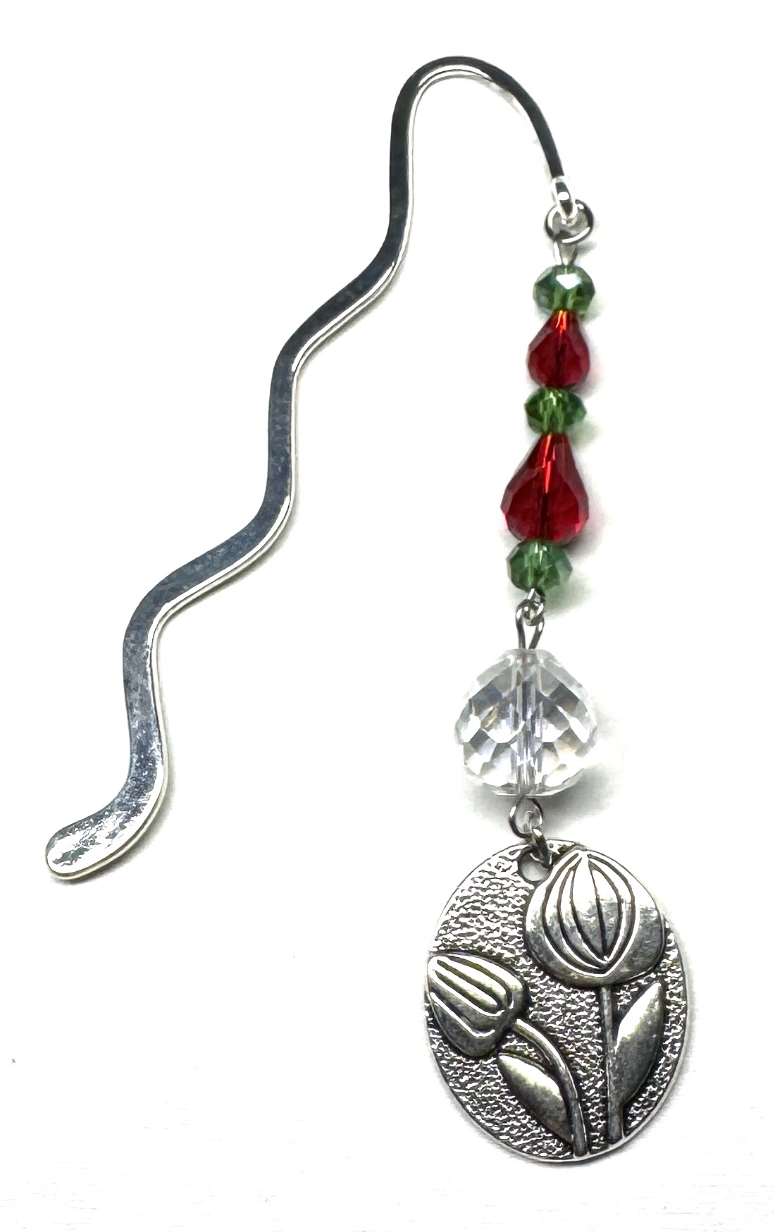 Lesezeichen mit verschiedenen, facettierten, glitzernden Glasperlen und Metallanhänger. Die Perlenseite fällt am Buchrücken herunter, man kann das Buch somit auch in ein Bücherregal stellen. 🙂
