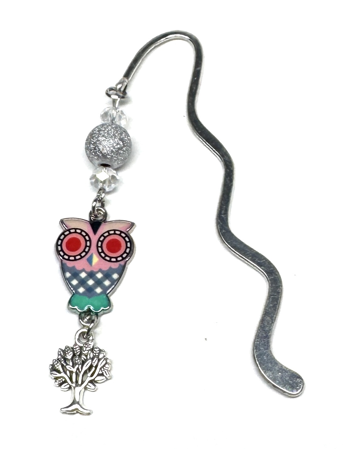 Lesezeichen mit facettierten, glitzernden Glasperlen, strukturierter Kunststoffperle, emaillierter Eule und Metallanhänger. Die Perlenseite fällt am Buchrücken herunter, man kann das Buch somit auch in ein Bücherregal stellen. 🙂