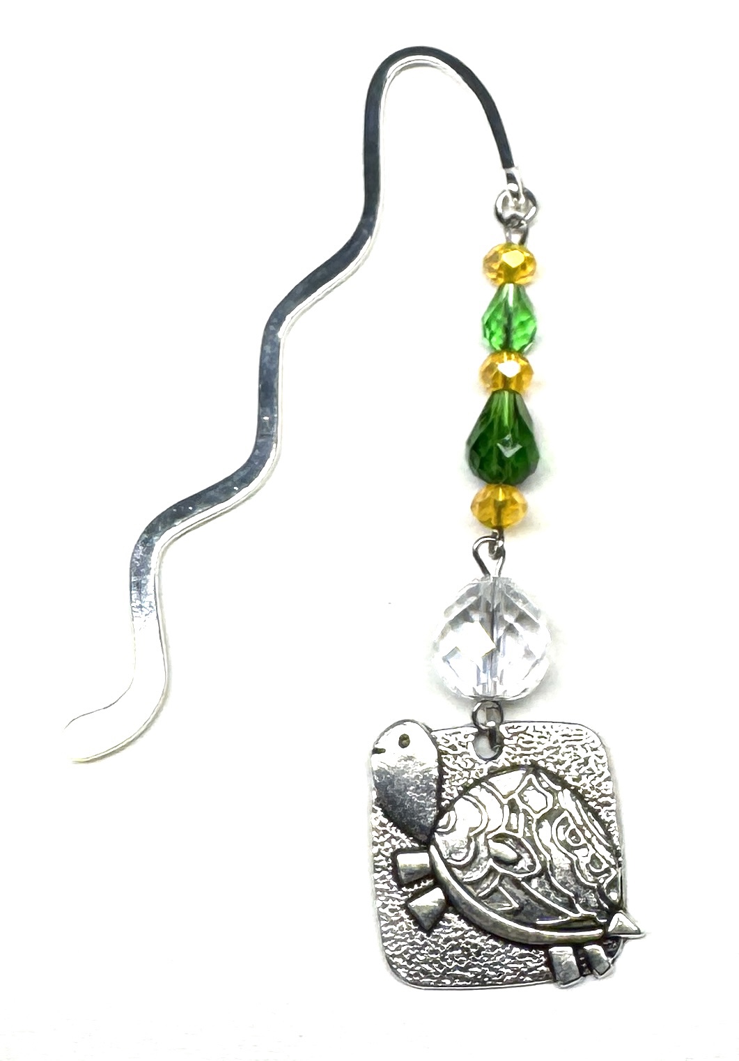 Lesezeichen mit verschiedenen, facettierten, glitzernden Glasperlen und Metallanhänger. Die Perlenseite fällt am Buchrücken herunter, man kann das Buch somit auch in ein Bücherregal stellen. 🙂