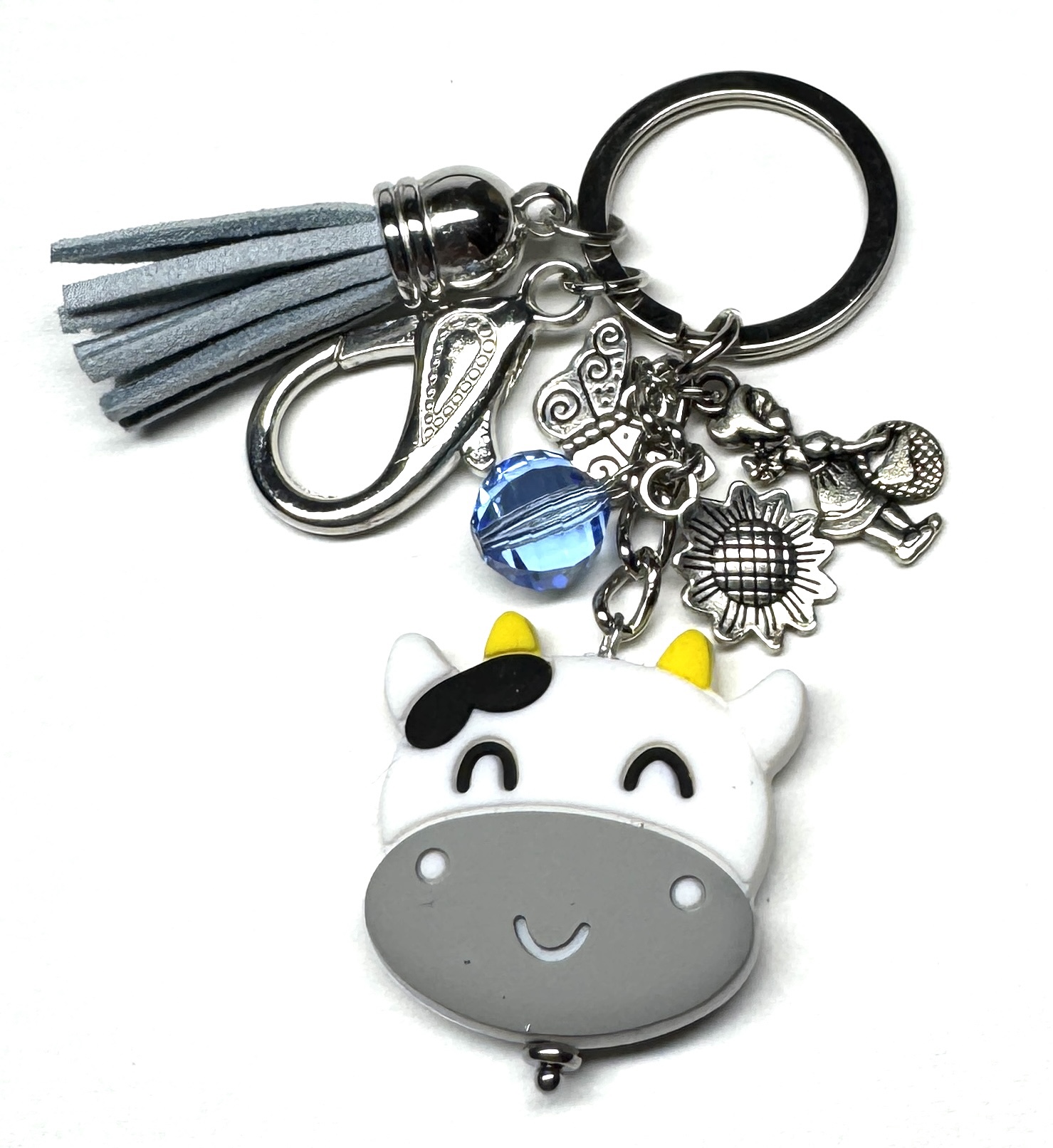 Schlüsselanhänger mit Motivanhänger aus Silikon, Glasperle und verschiedenen Charms, Karabiner und Kunstlederanhänger.