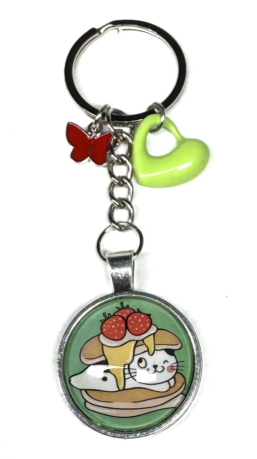 Stabiler Schlüsselanhänger mit selbstgefertigtem Glascabochon, emailliertem Herz und Schmetterling.