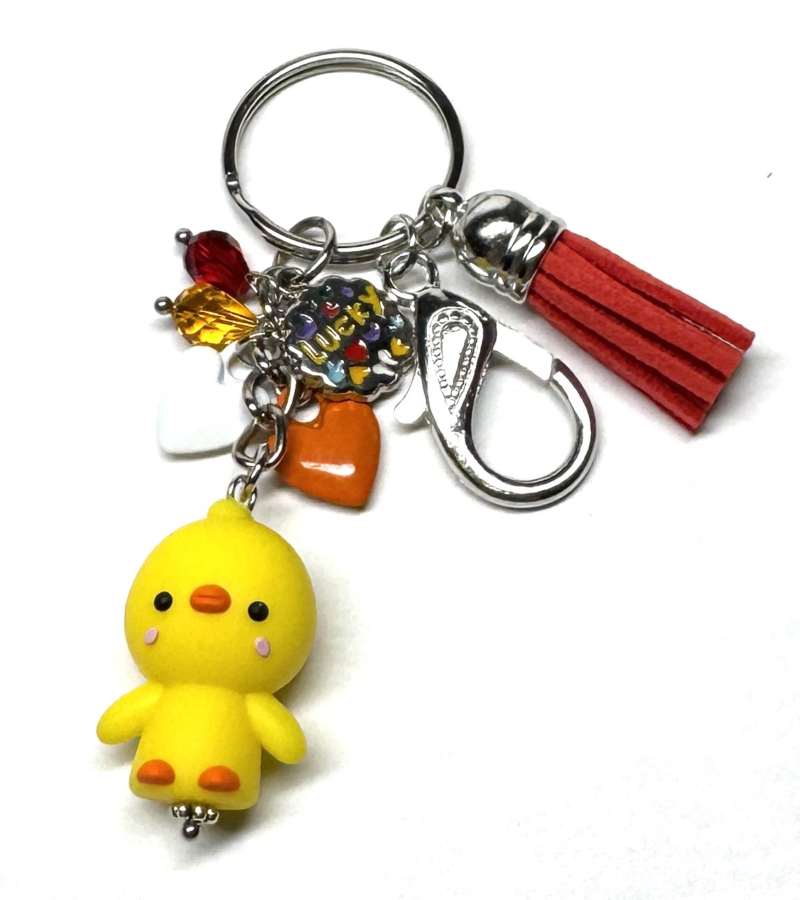 Schlüsselanhänger mit Anhänger aus Silikon (beidseitiges Motiv), Glasperlen, Herz-Charmes, emailliertem Anhänger, Karabiner und Kunstlederanhänger.