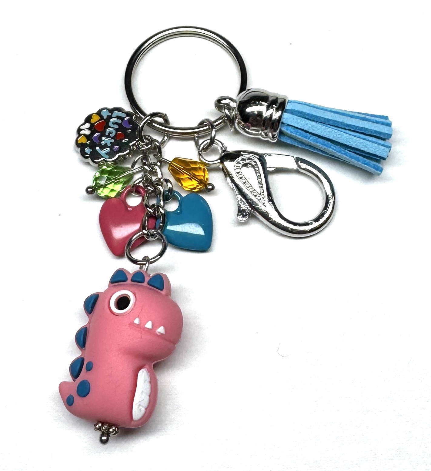 Schlüsselanhänger mit Anhänger aus Silikon (beidseitiges Motiv), Glasperlen, Herz-Charmes, emailliertem Anhänger, Karabiner und Kunstlederanhänger.