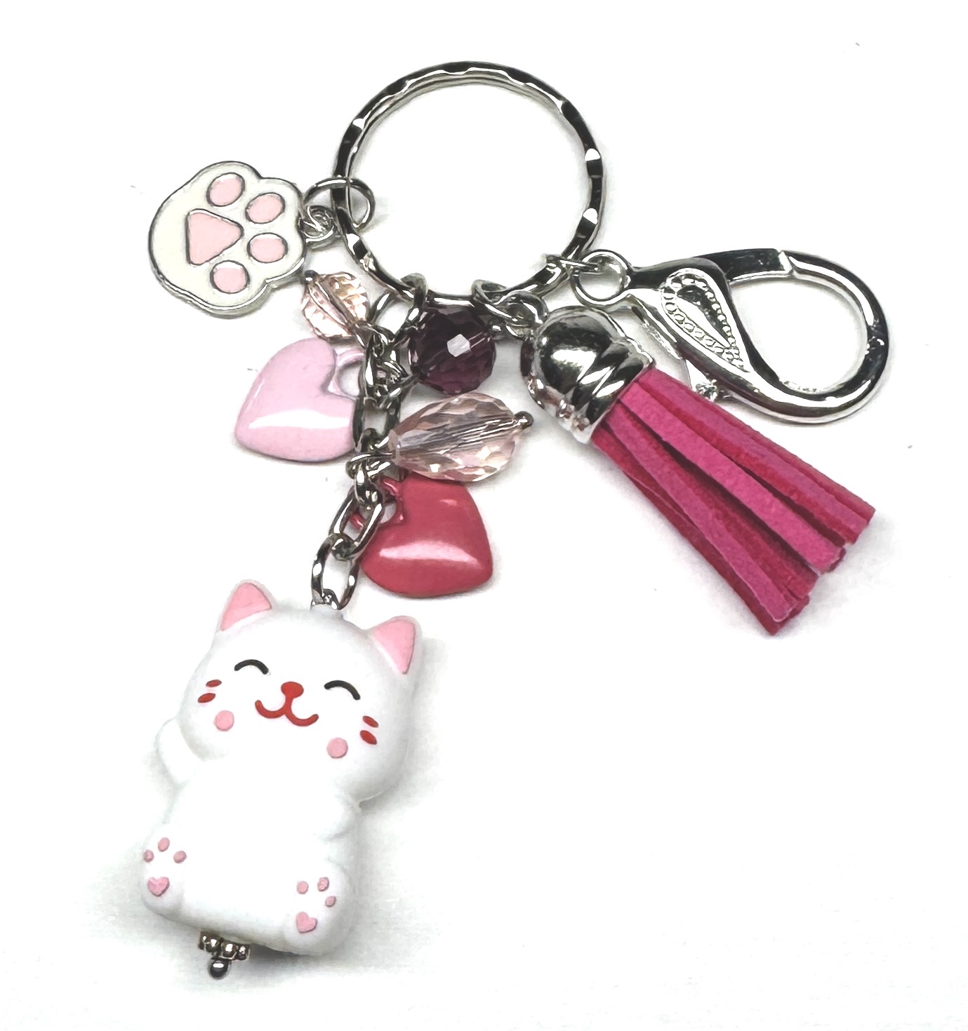 Schlüsselanhänger mit Anhänger aus Silikon (beidseitiges Motiv), Glasperlen, Herz-Charmes, emailliertem Anhänger, Karabiner und Kunstlederanhänger.