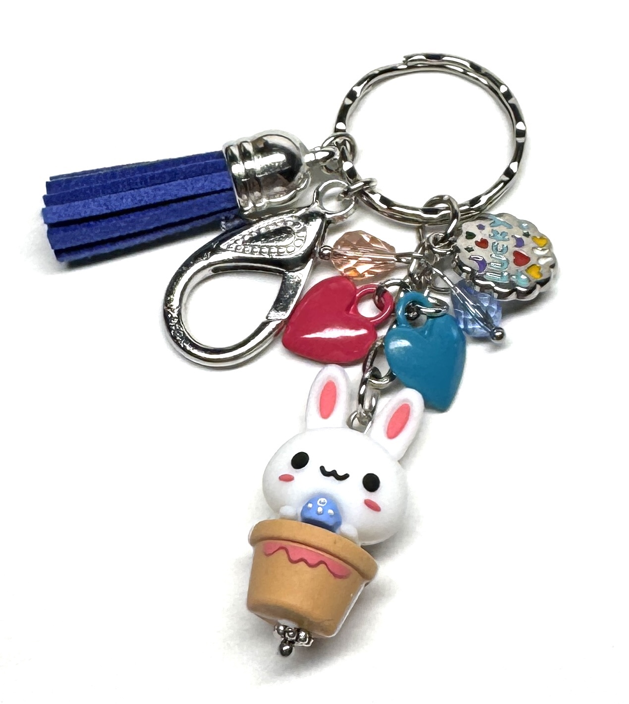 Schlüsselanhänger mit Anhänger aus Silikon (beidseitiges Motiv), Glasperlen, Herz-Charmes, emailliertem Anhänger, Karabiner und Kunstlederanhänger.