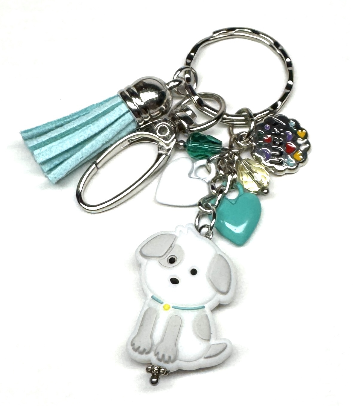 Schlüsselanhänger mit Anhänger aus Silikon (beidseitiges Motiv), Glasperlen, Herz-Charmes, emailliertem Anhänger, Karabiner und Kunstlederanhänger.