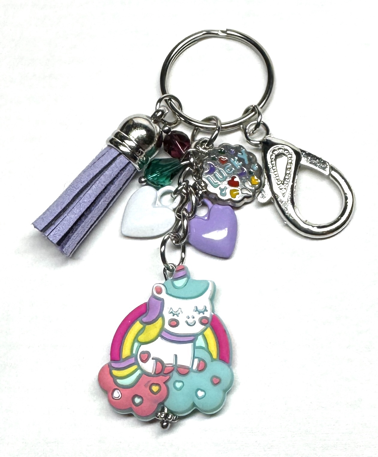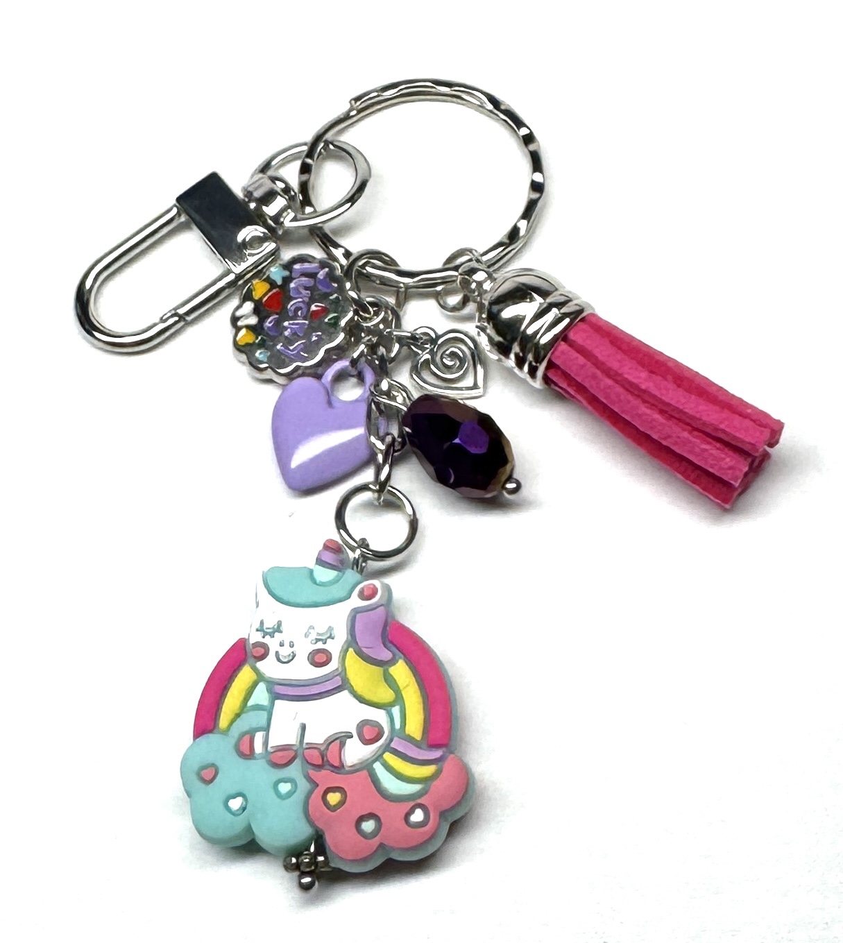 Schlüsselanhänger mit Anhänger aus Silikon (beidseitiges Motiv), Glasperlen, Herz-Charmes, emailliertem Anhänger, Karabiner und Kunstlederanhänger.