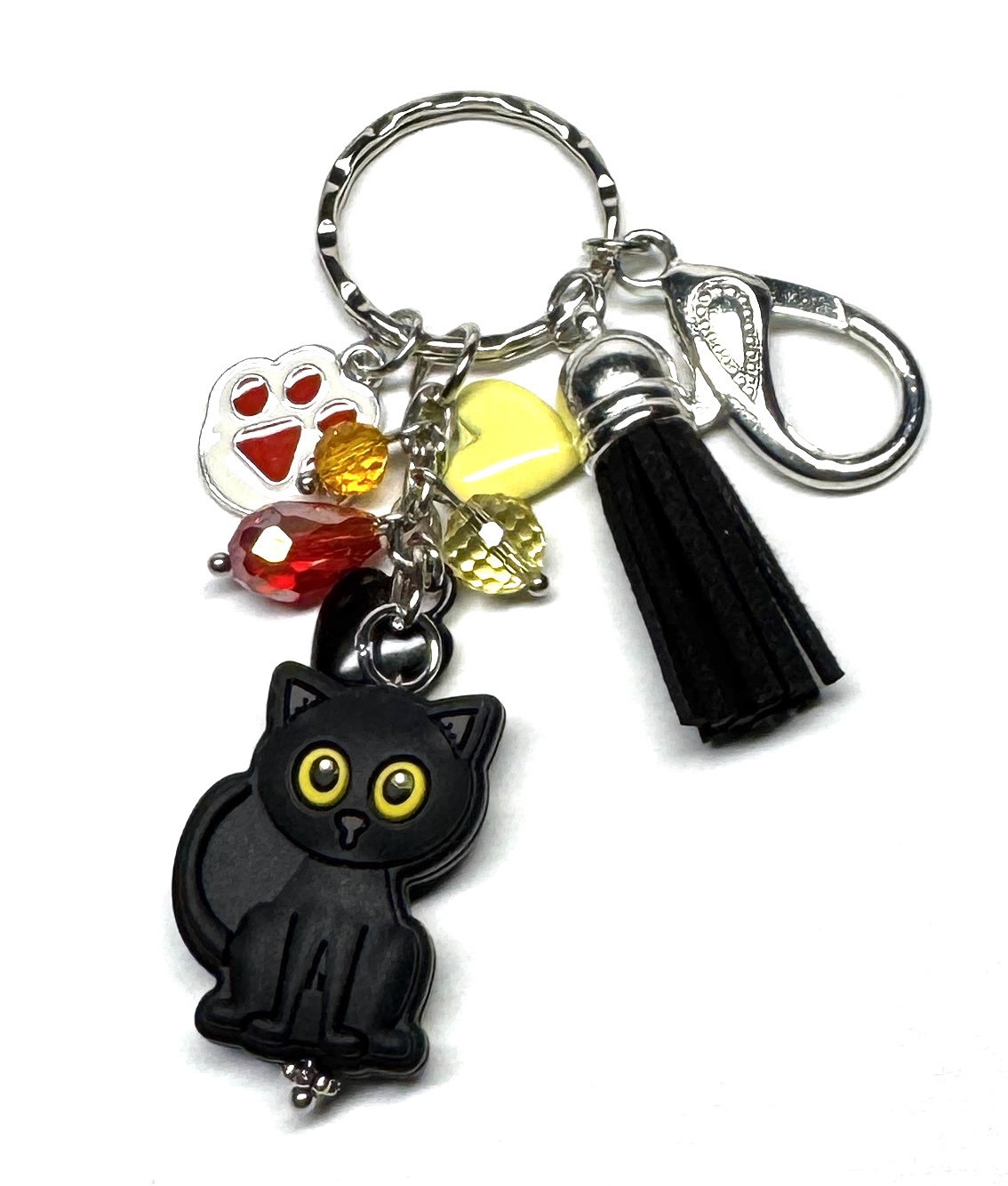 Schlüsselanhänger mit Anhänger aus Silikon (beidseitiges Motiv), Glasperlen, Herz-Charmes, emailliertem Anhänger, Karabiner und Kunstlederanhänger.