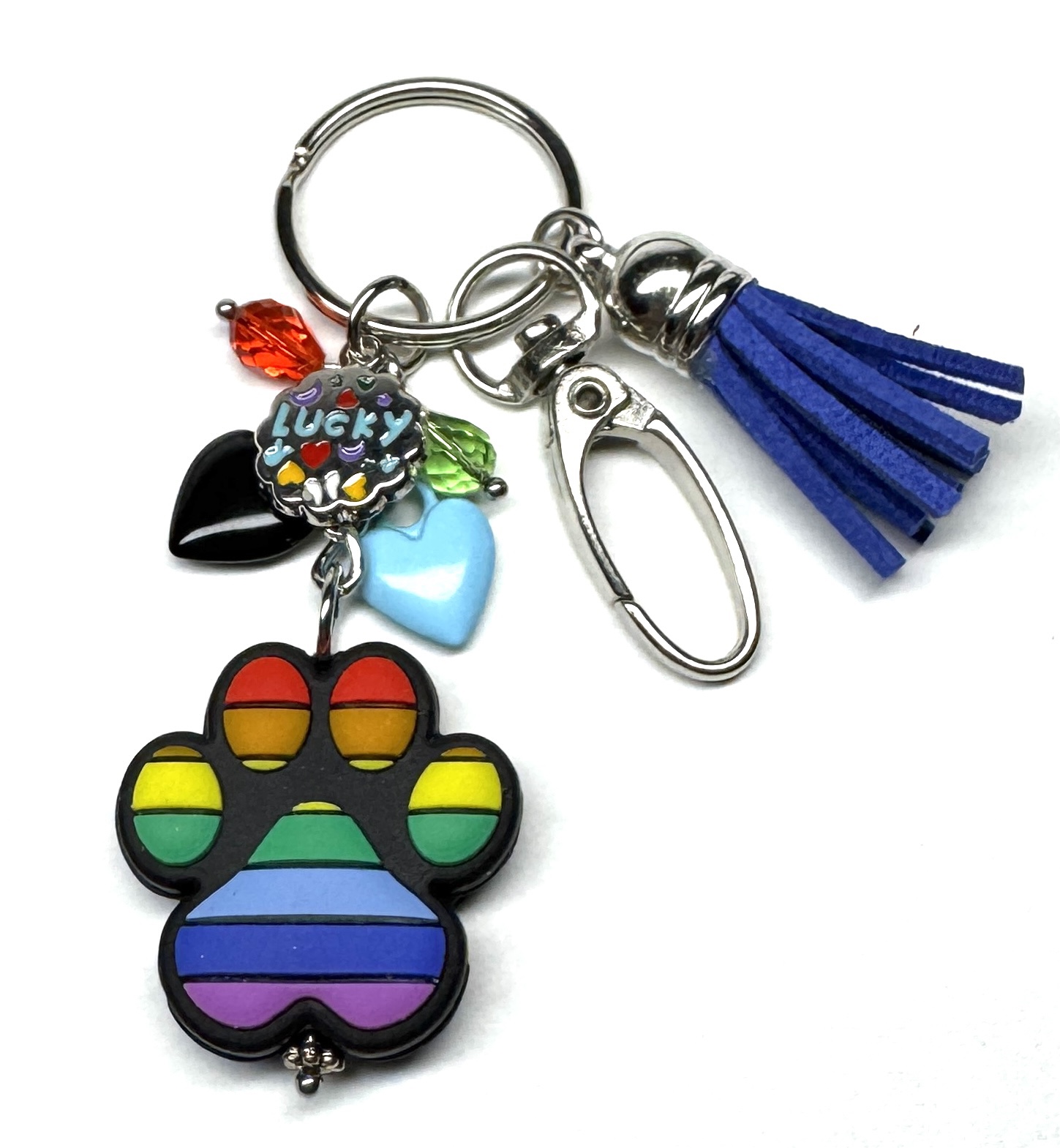 Schlüsselanhänger mit Anhänger aus Silikon (beidseitiges Motiv), Glasperlen, Herz-Charmes, emailliertem Anhänger, Karabiner und Kunstlederanhänger.