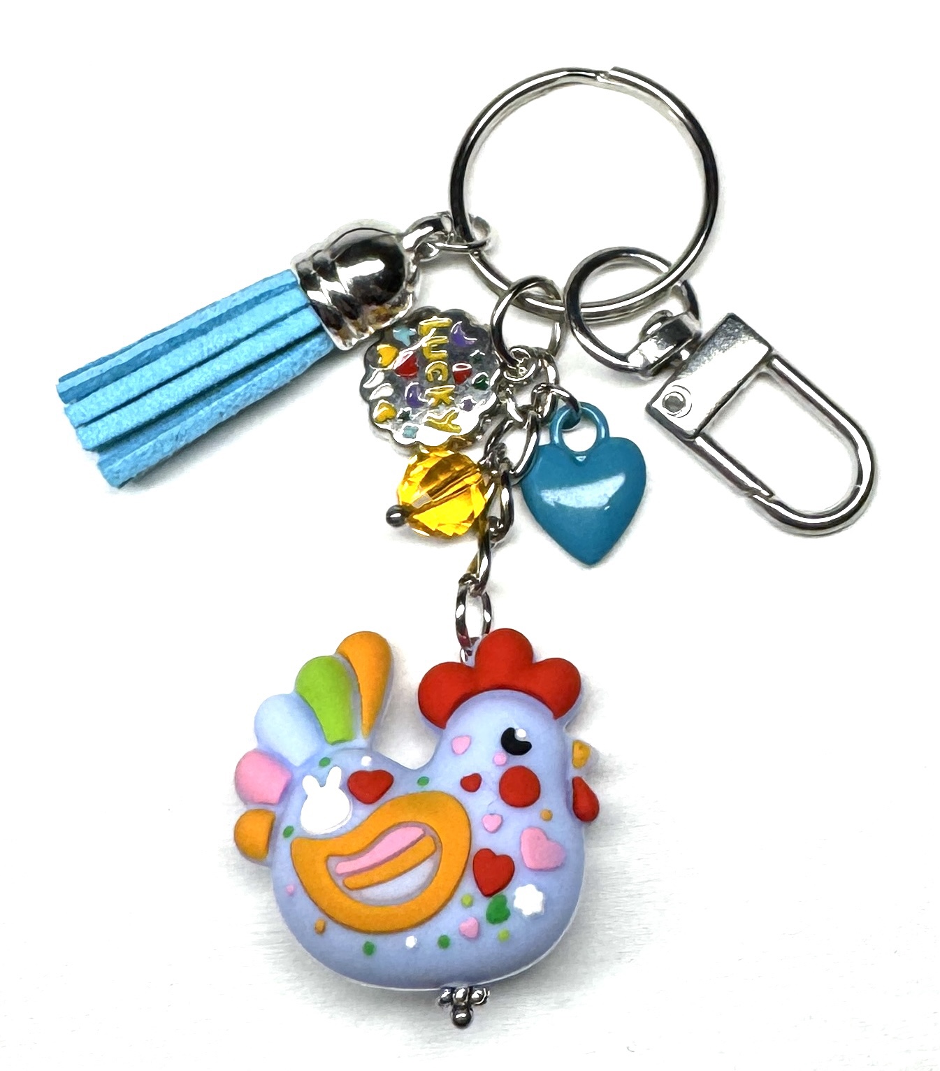 Schlüsselanhänger mit großer 3-D Silikonperle (beidseitiges Motiv), Glasperle, Herz-Charme, emailliertem Anhänger, Karabiner und Kunstlederanhänger.