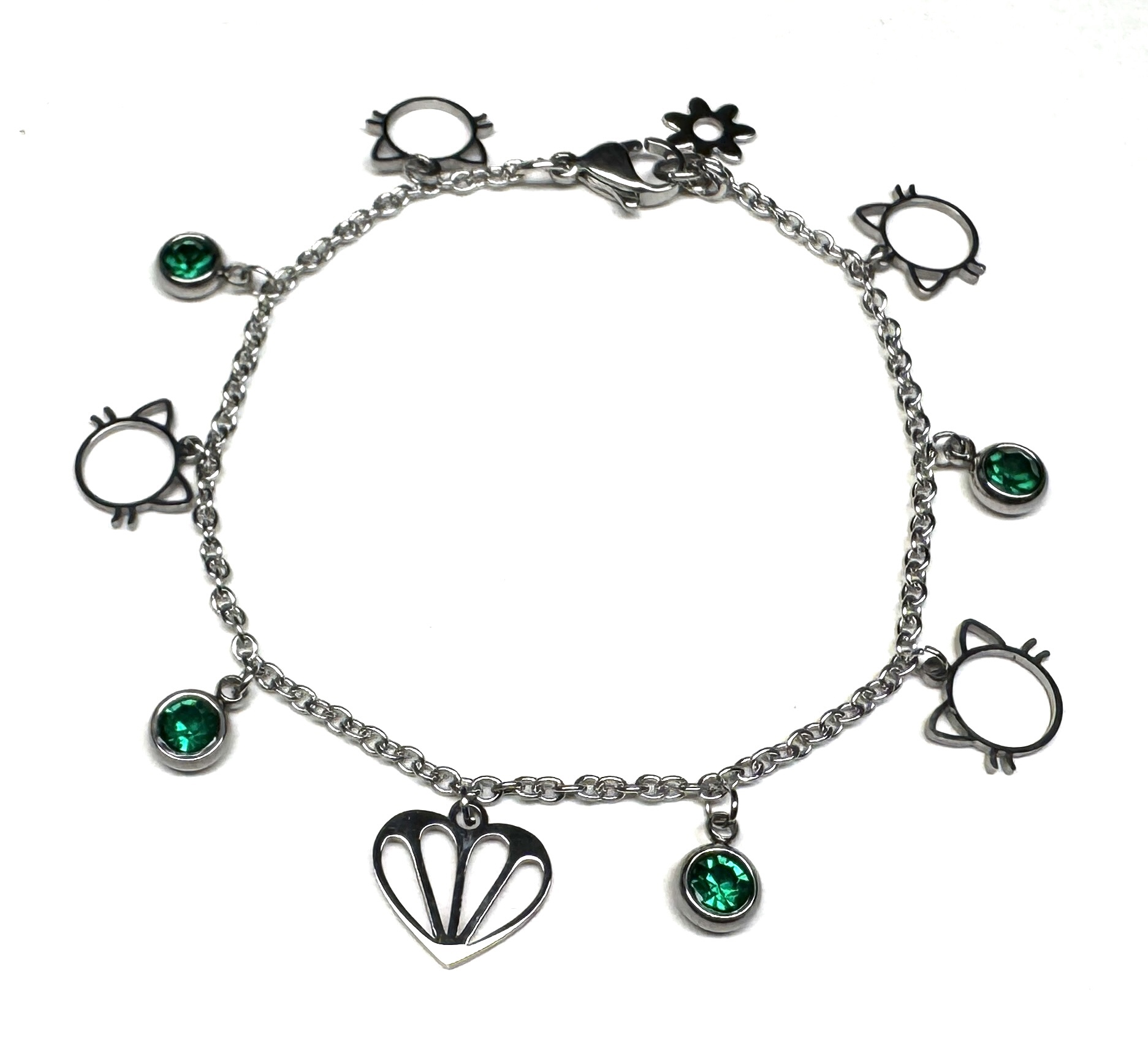 Armband aus Edelstahl mit strassbesetzten Edelstahlsequins und Edelstahlcharmes. Karabinerverschluss.