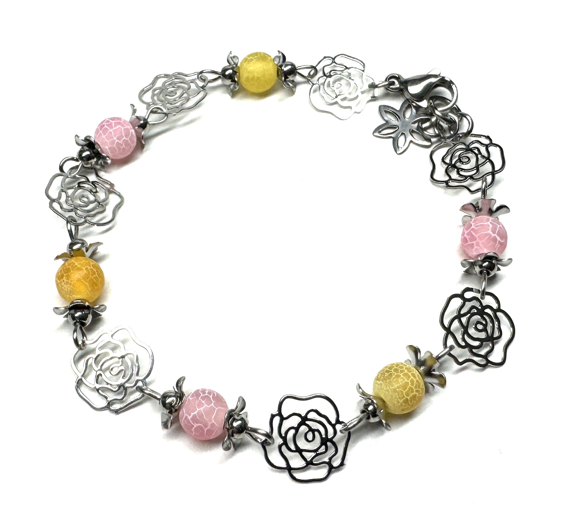 Armband aus Firecrackle Achatperlen, Edelstahlperlen, Perlkappen und Charmes aus Edelstahl. Karabinerverschluss.