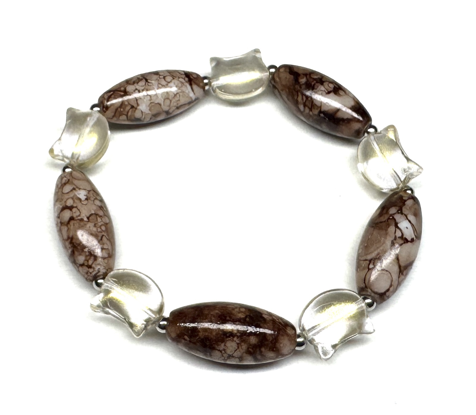 Elastisches Armband aus Glasperlen in Katzenkopfform, Edelstahlperlen und großen Glasperlen im Acryl-Look.
