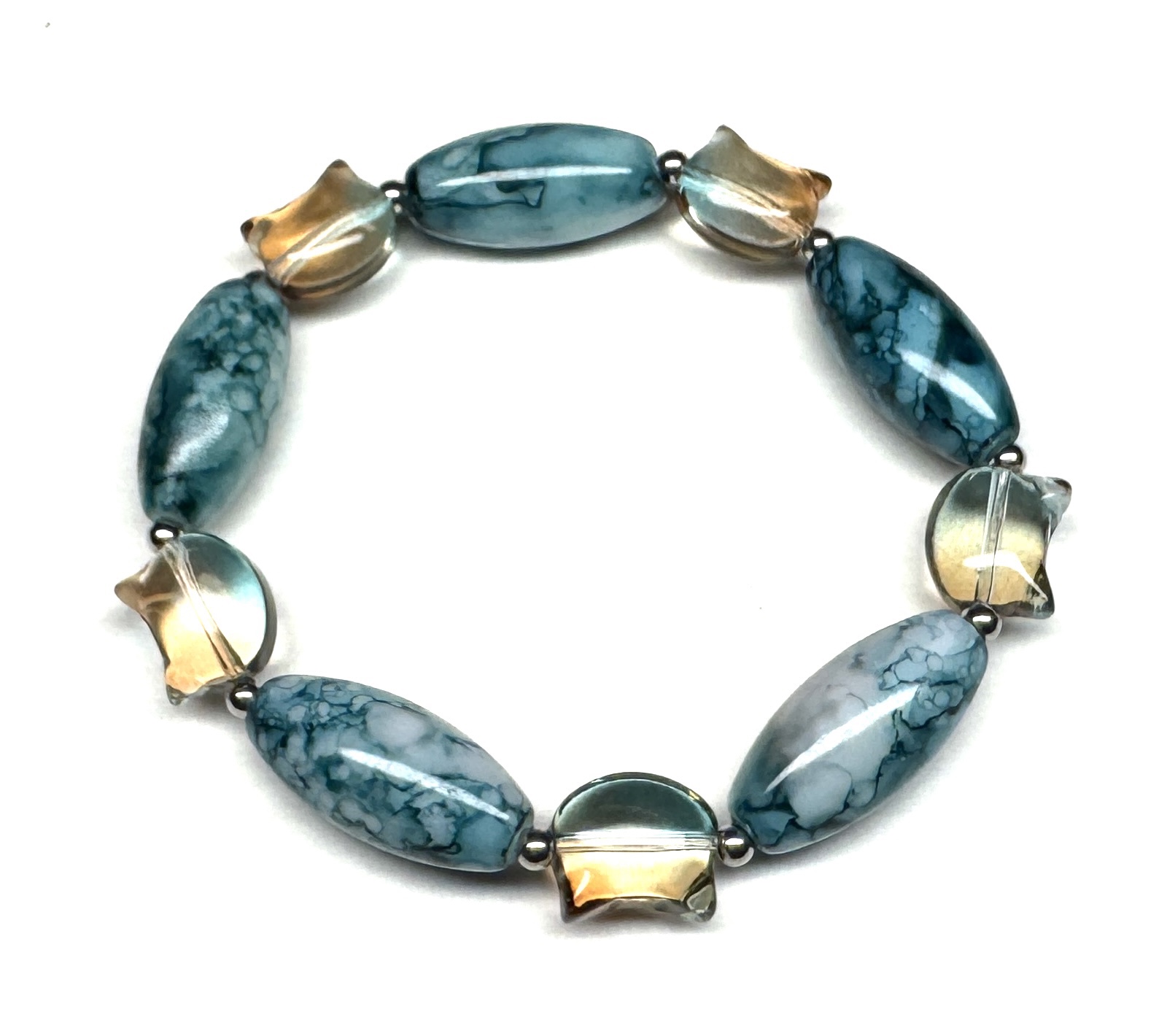 Elastisches Armband aus Glasperlen in Katzenkopfform, Edelstahlperlen und großen Glasperlen im Acryl-Look.
