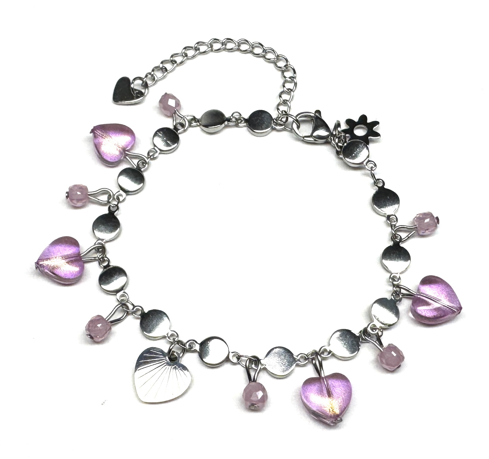 Armband aus Edelstahlsequins, Herzen aus Glas, Zirkonia-Steinchen und Edelstahl-Charme.