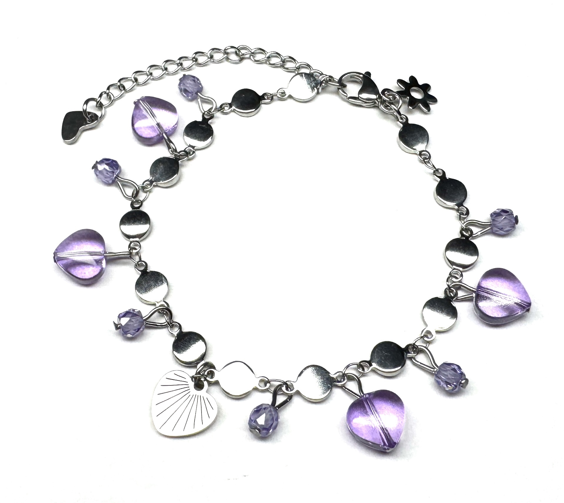 Armband aus Edelstahlsequins, Herzen aus Glas, Zirkonia-Steinchen und Edelstahl-Charme.