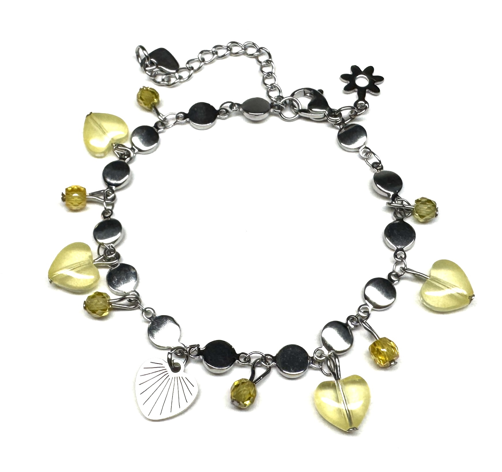 Armband aus Edelstahlsequins, Herzen aus Glas, Zirkonia-Steinchen und Edelstahl-Charme.