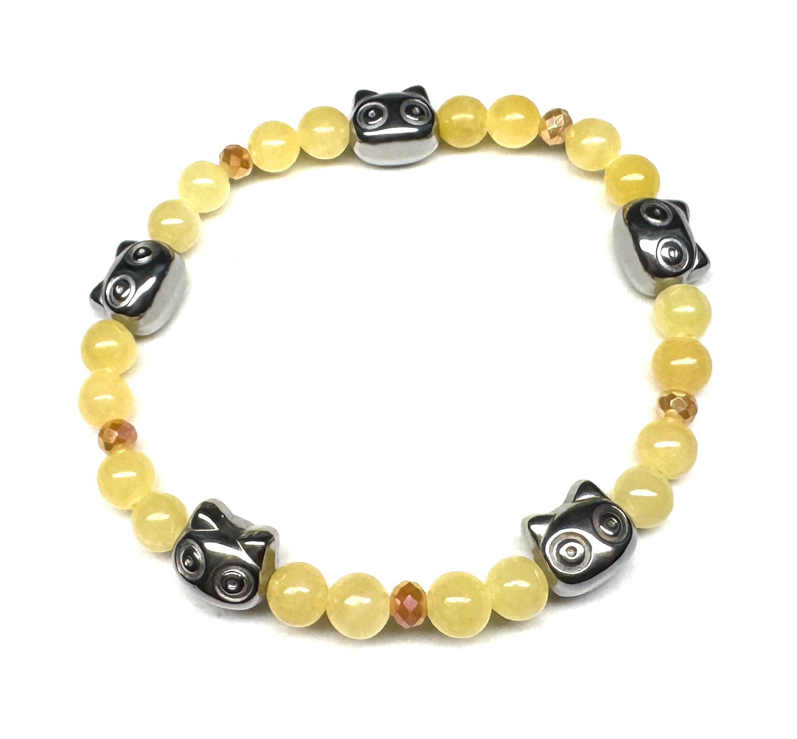 Elastisches Armband aus Orangencalcit, facettierten Glasperlen und wunderschönen Katzen aus Edelstahl.