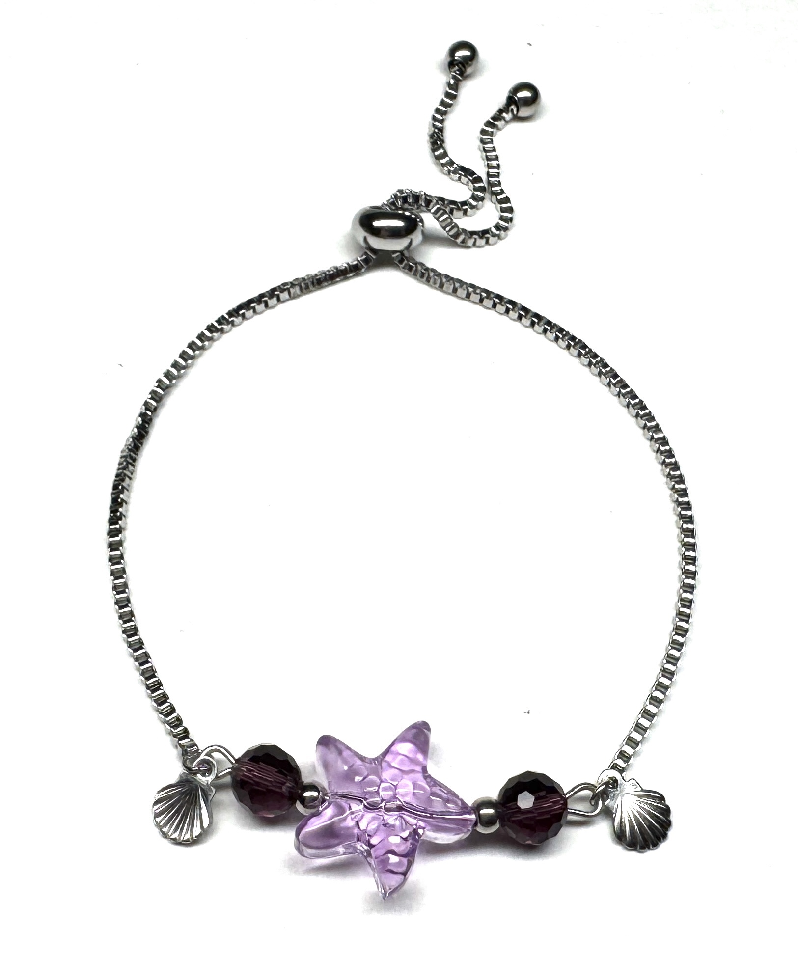 Armband aus Edelstahl mit Seestern aus Glas, Edelstahlperlen, geschliffenen Glasperlen (Swarovski Imitat) und Charmes aus Edelstahl. Das Armband ist größenverstellbar und passt auf jedes Handgelenk. Sehr schmale Personen könnten es vielleicht sogar als Fußkettchen verwenden. 🙂