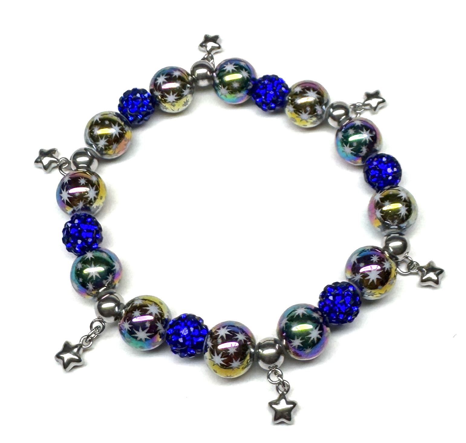 Elastisches Armband mit bedruckten, irisierenden Glasperlen, Polymerton-Perlen mit Strassbesatz und kleinen Edelstahlsternchen.