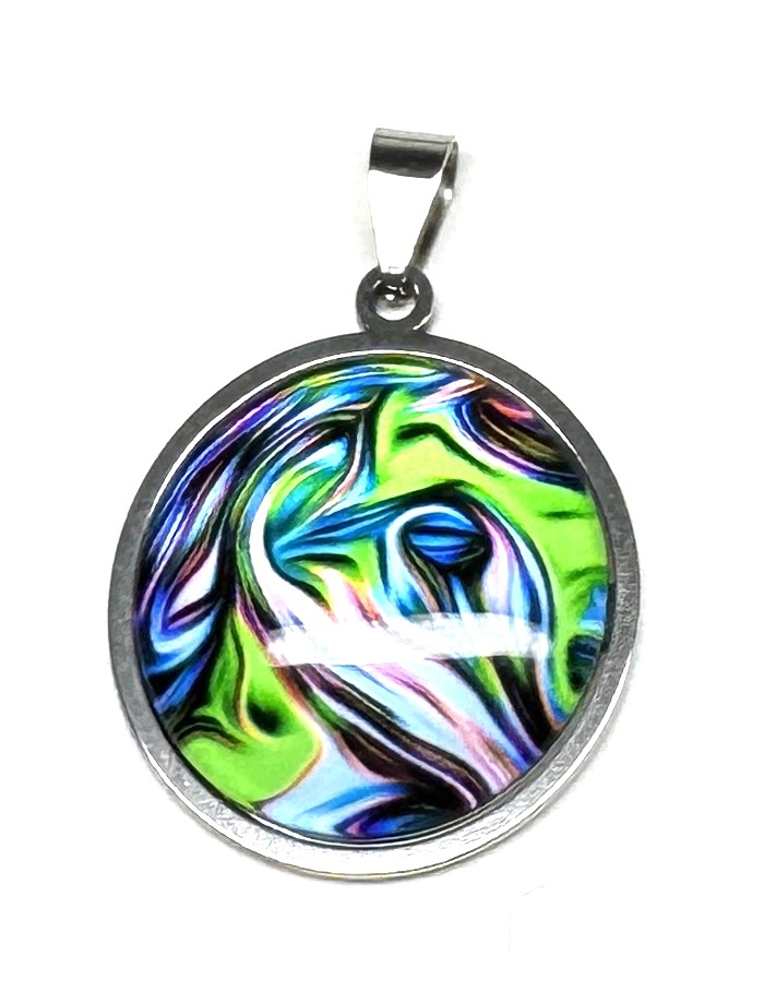 Anhänger aus stabilem Edelstahlrahmen und Glas-Cabochon.