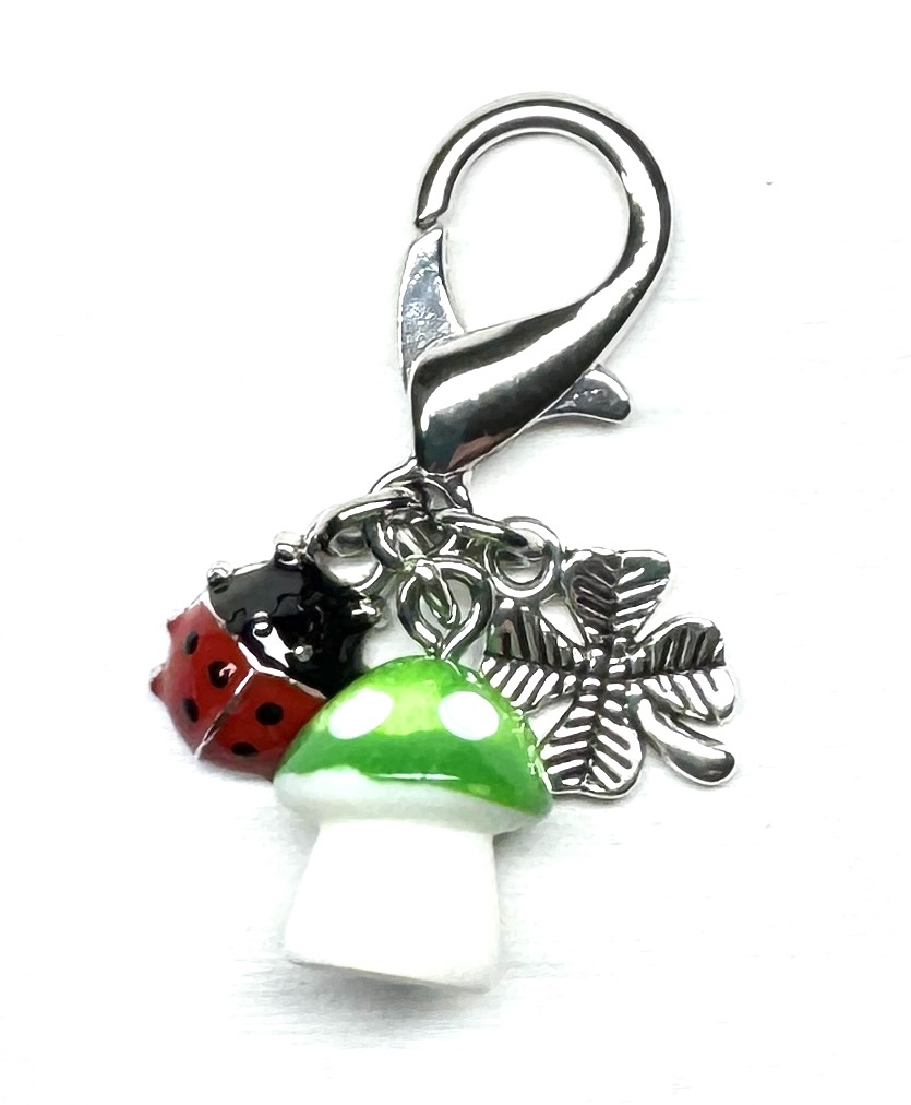 Glücksbringer mit Fliegenpilz aus Resin, emailliertem Marienkäfer und Kleeblatt. Kann mit dem Karabiner befestigt werden.