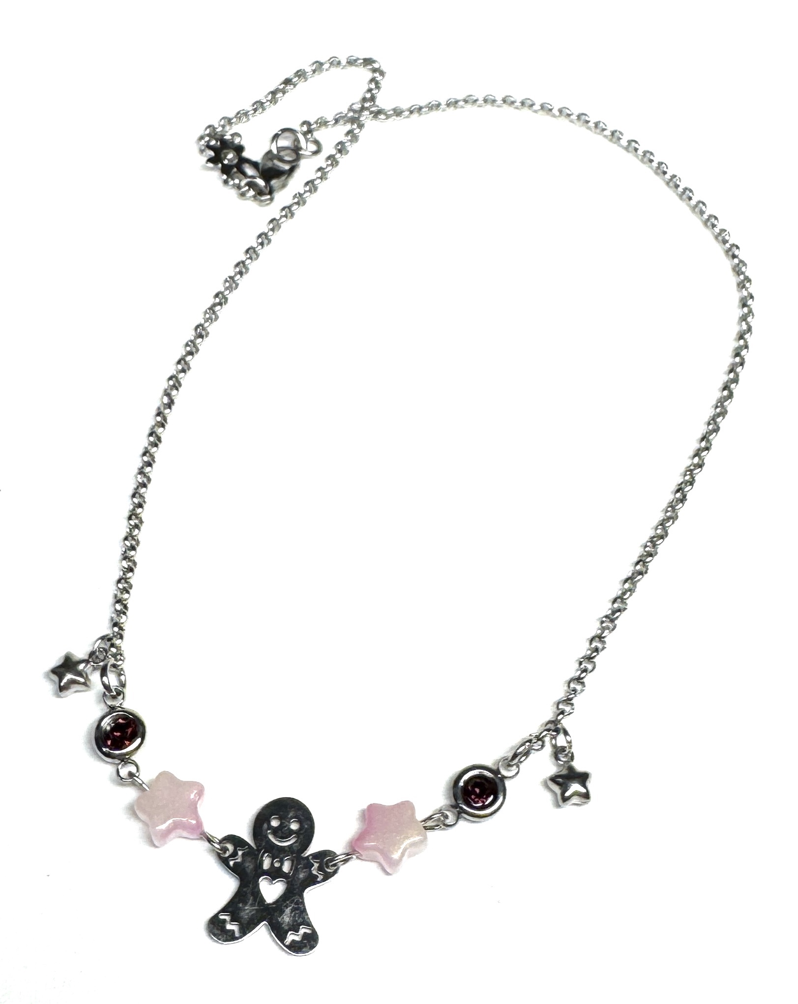 Halskette aus Edelstahl mit Glassternen, glitzernden Edelstahlverbindern, Sternchen und Lebkuchenmann aus Edelstahl. Fällt schön rund um den Hals. 🙂