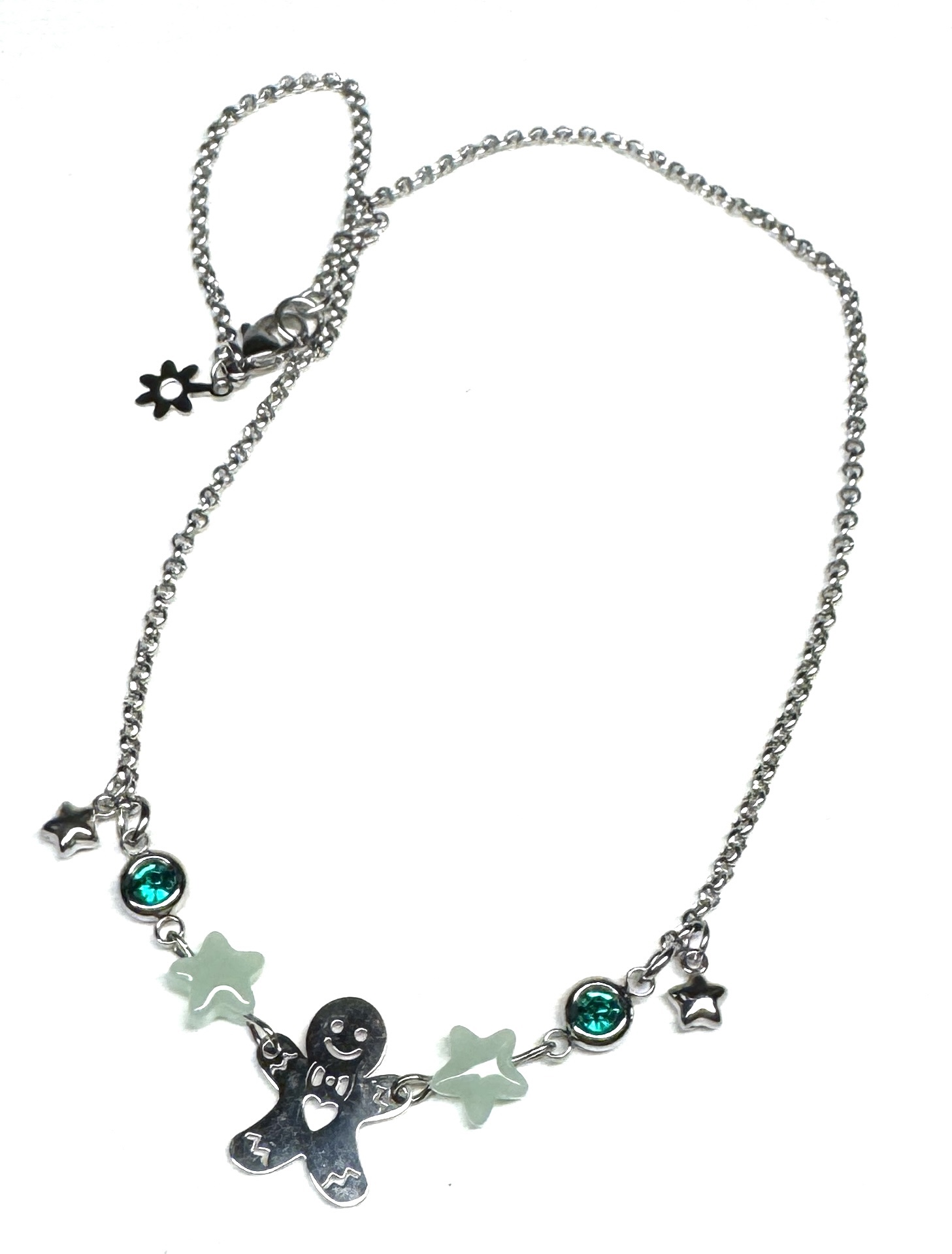 Halskette aus Edelstahl mit Glassternen, glitzernden Edelstahlverbindern, Sternchen und Lebkuchenmann aus Edelstahl. Fällt schön rund um den Hals. 🙂