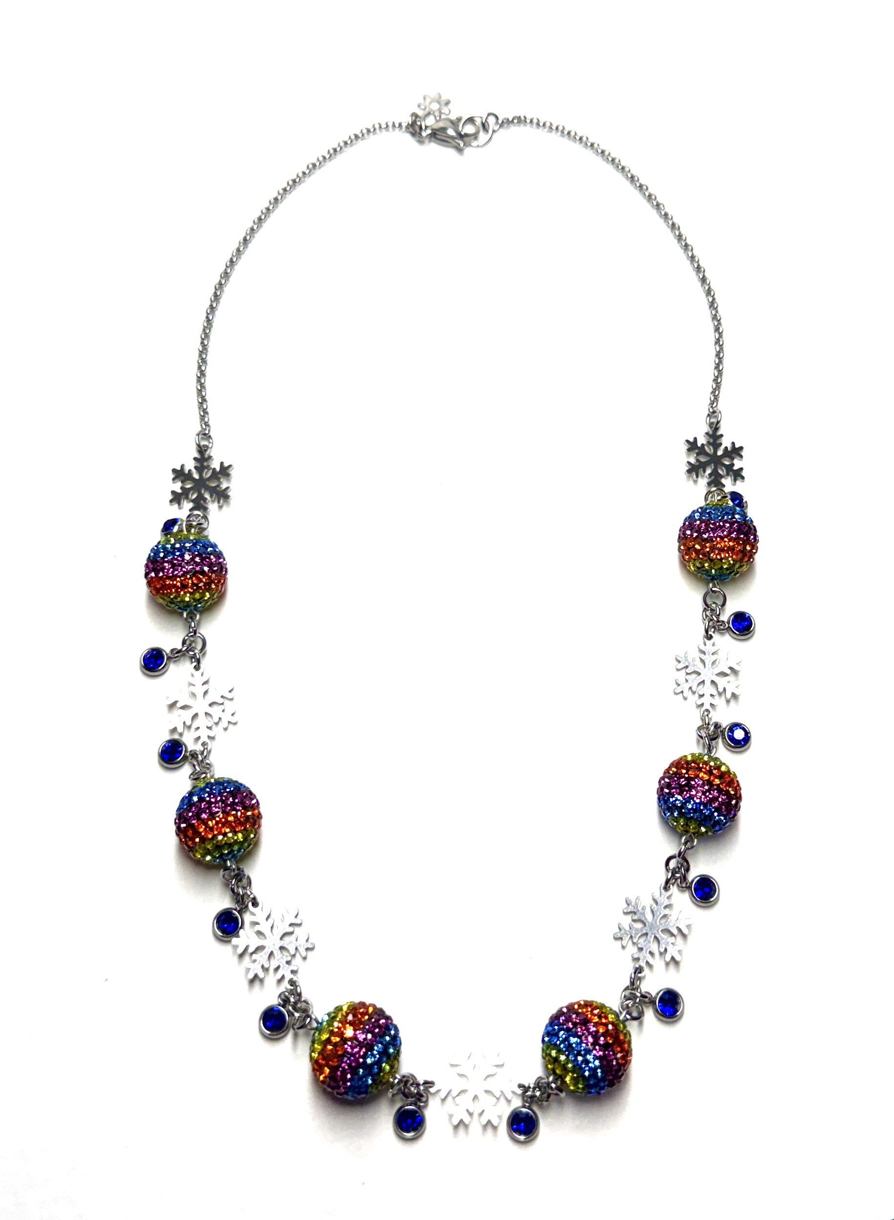 Halskette mit großen Polymerton-Perlen mit Strass-Besatz, Schneeflocken aus Edelstahl und kleinen Edelstahl-Charmes mit facettiertem Glasbesatz.