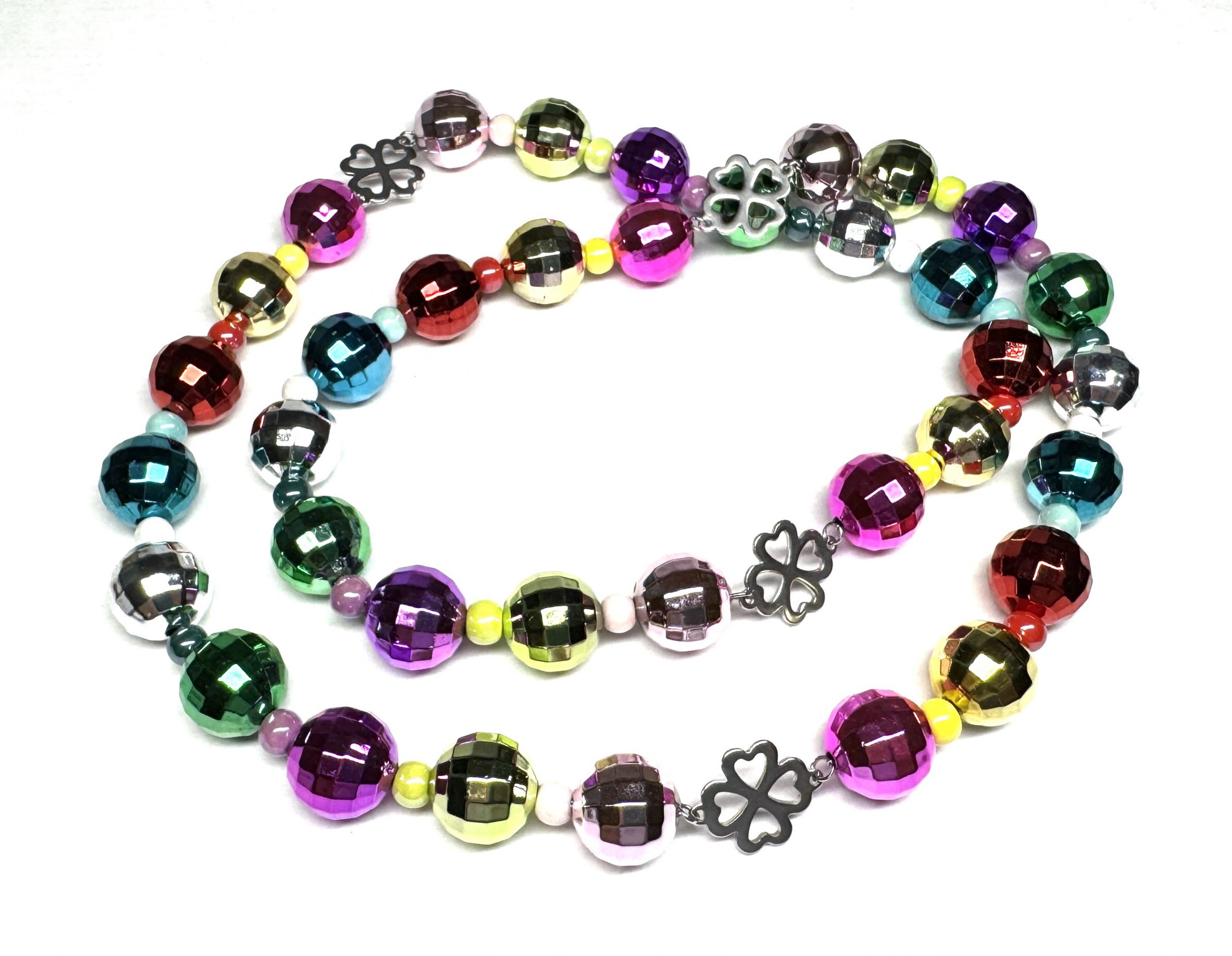 Extralange, glänzende Halskette mit großen Acrylperlen, Kleeblättern aus Edelstahl und Keramikperlen.