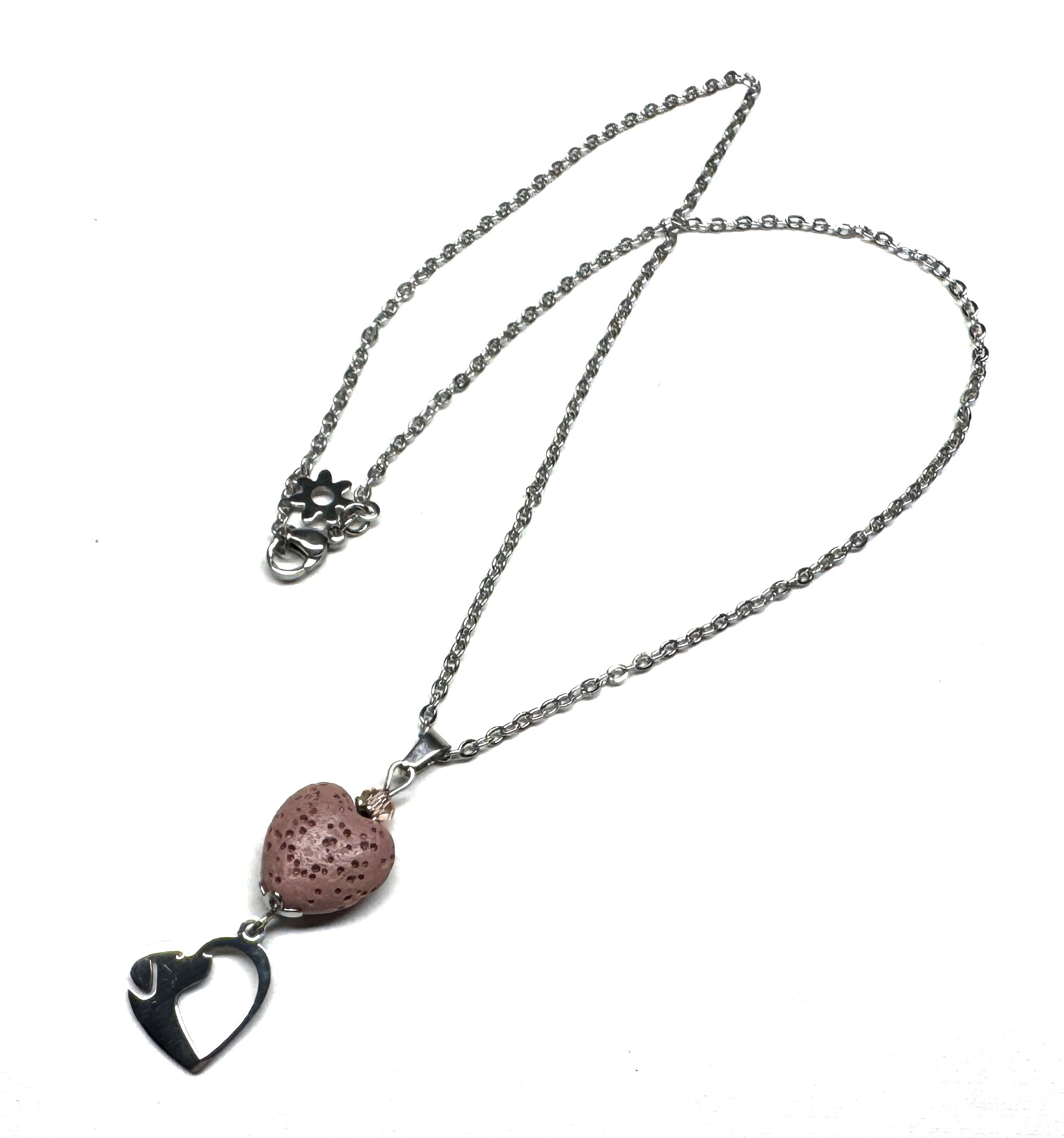 Edelstahlkette mit Anhänger aus Lavastein-Herz, Edelstahlcharme, Perlkappen aus Edelstahl und facettierter Glasperle. Karabinerverschluss.