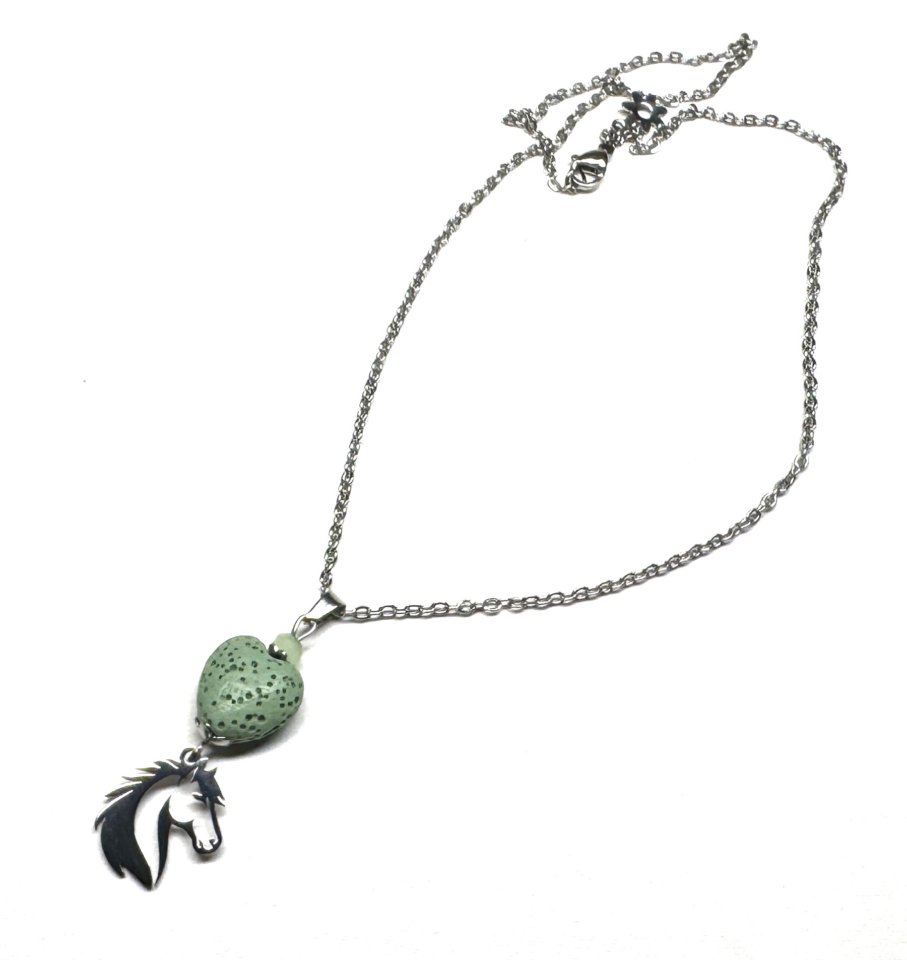 Edelstahlkette mit Anhänger aus Lavastein-Herz, Edelstahlcharme, Perlkappen aus Edelstahl und facettierter Glasperle. Karabinerverschluss.