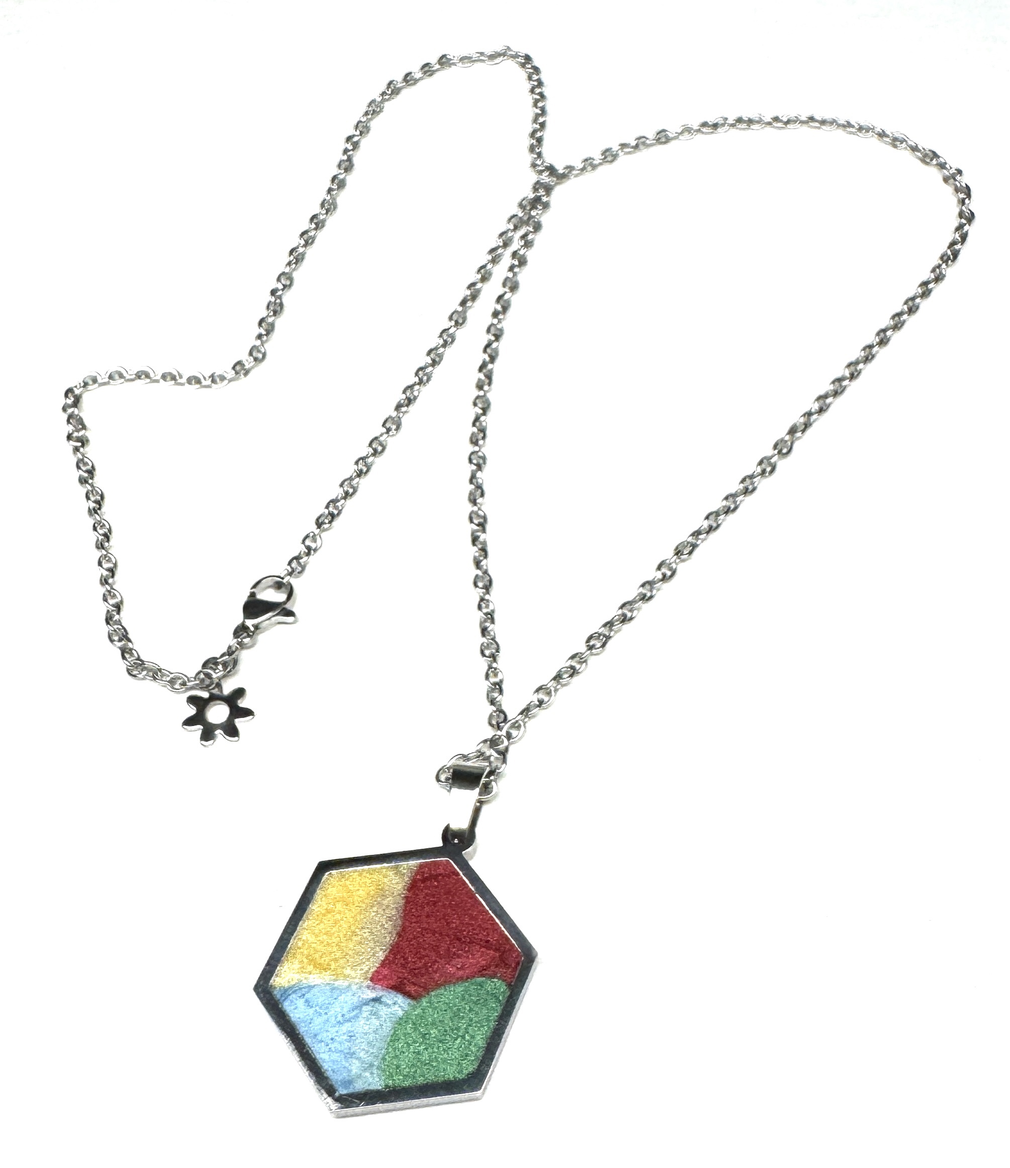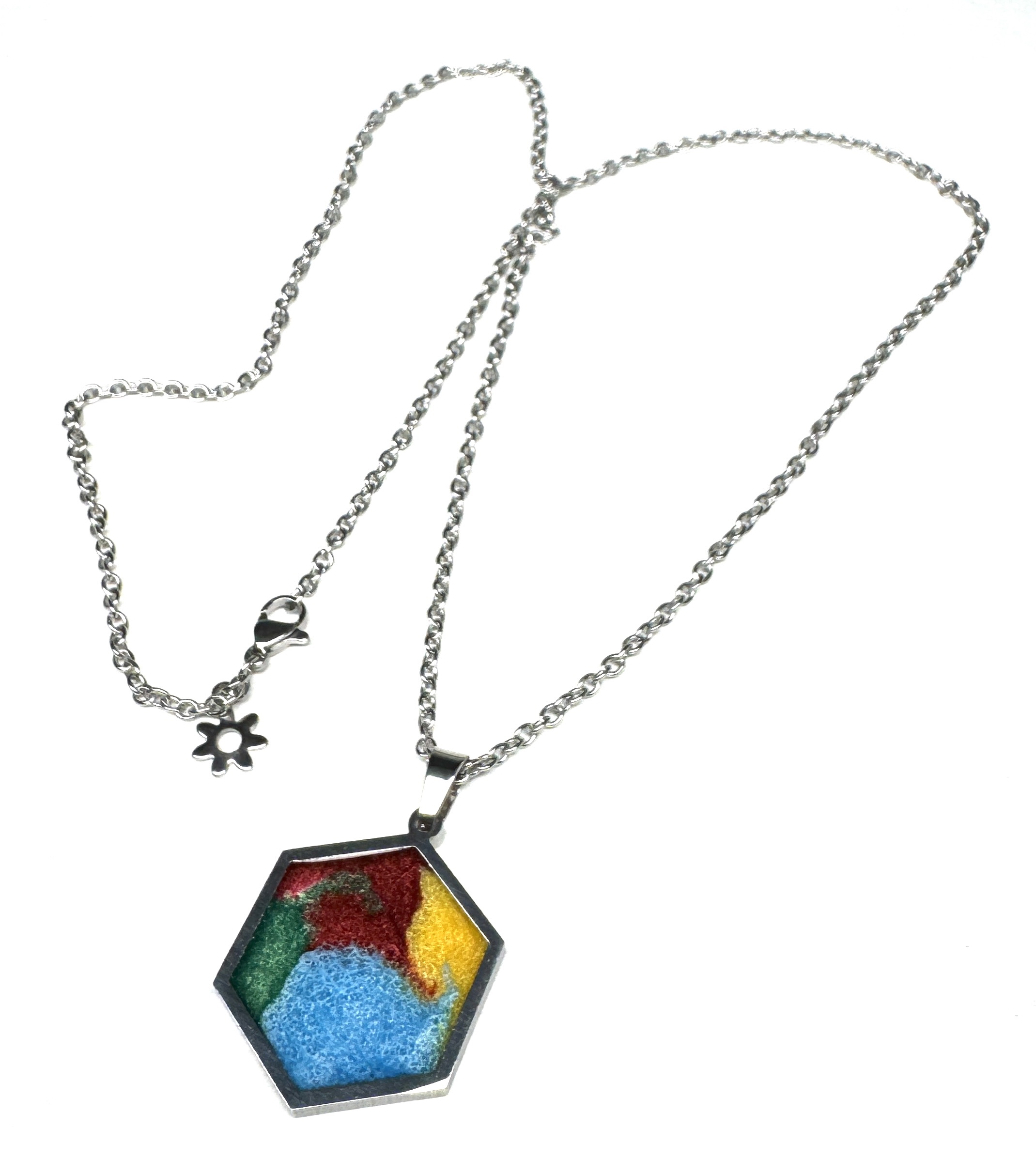 Halskette aus Edelstahl mit selbst gegossenem Anhänger aus Resin (Epoxidharz) und Mica-Pulver im Edelstahlrahmen.