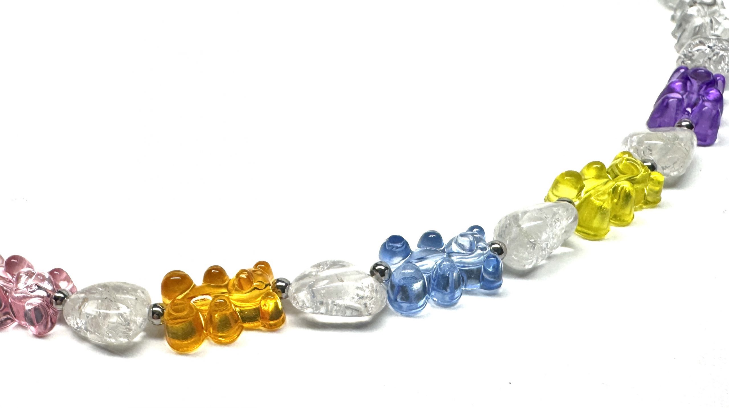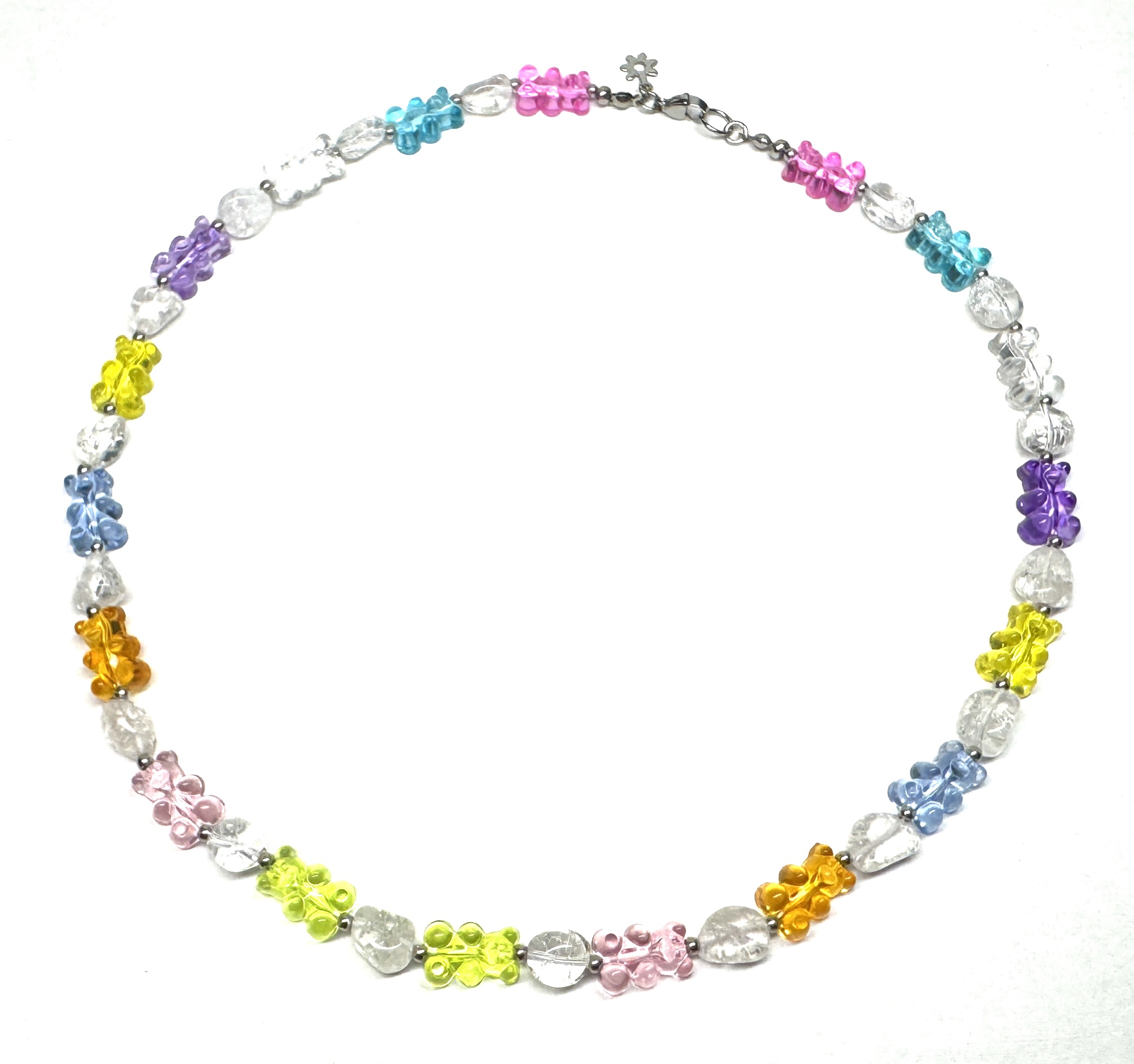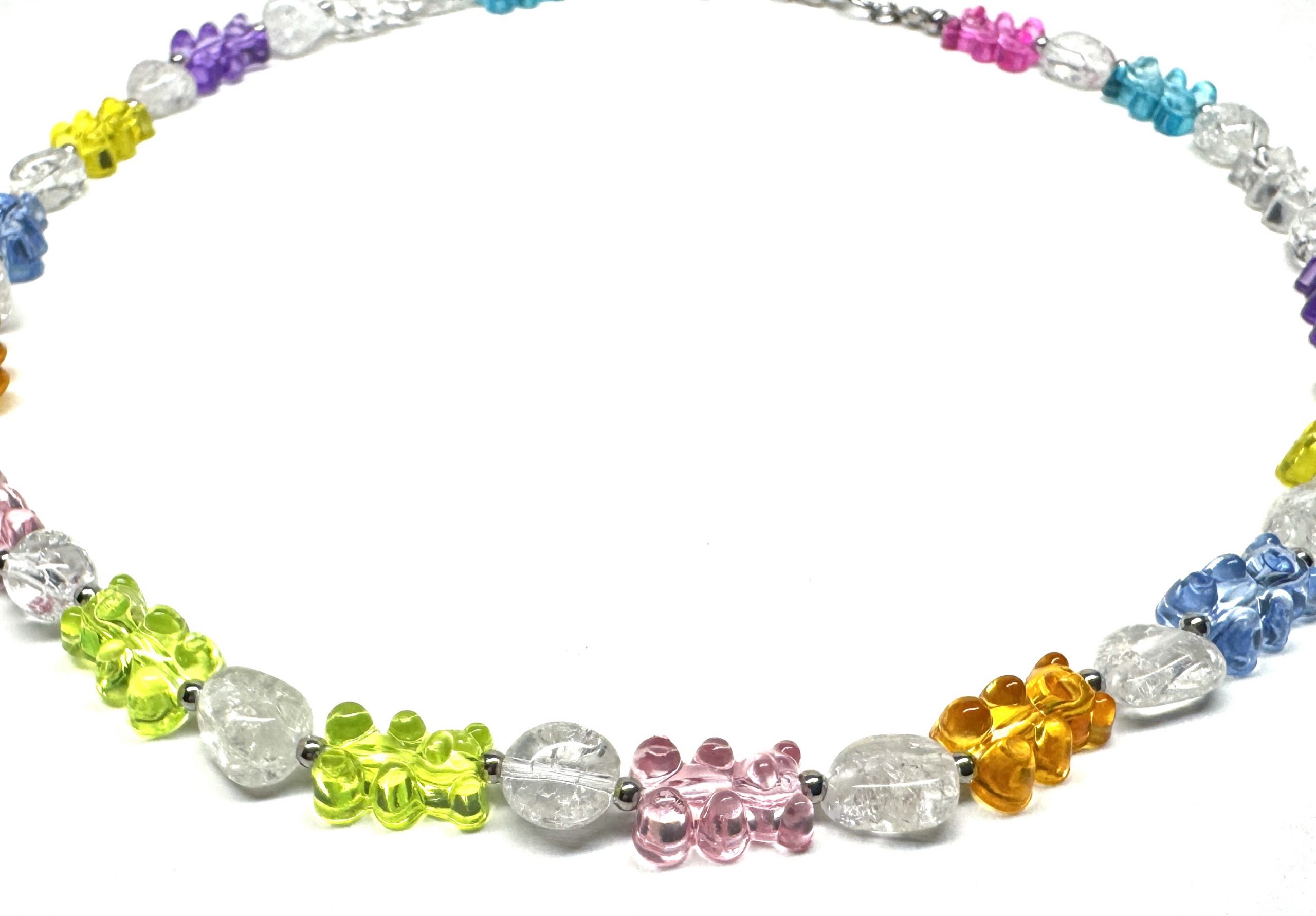 Verspielte Kette für extrovertierte Menschen, die es gerne bunt haben. Sie besteht aus Acryl-Perlen in Gummibär-Form, Edelstahlperlen und Bergkristall-Nuggets. Karabinerverschluss.