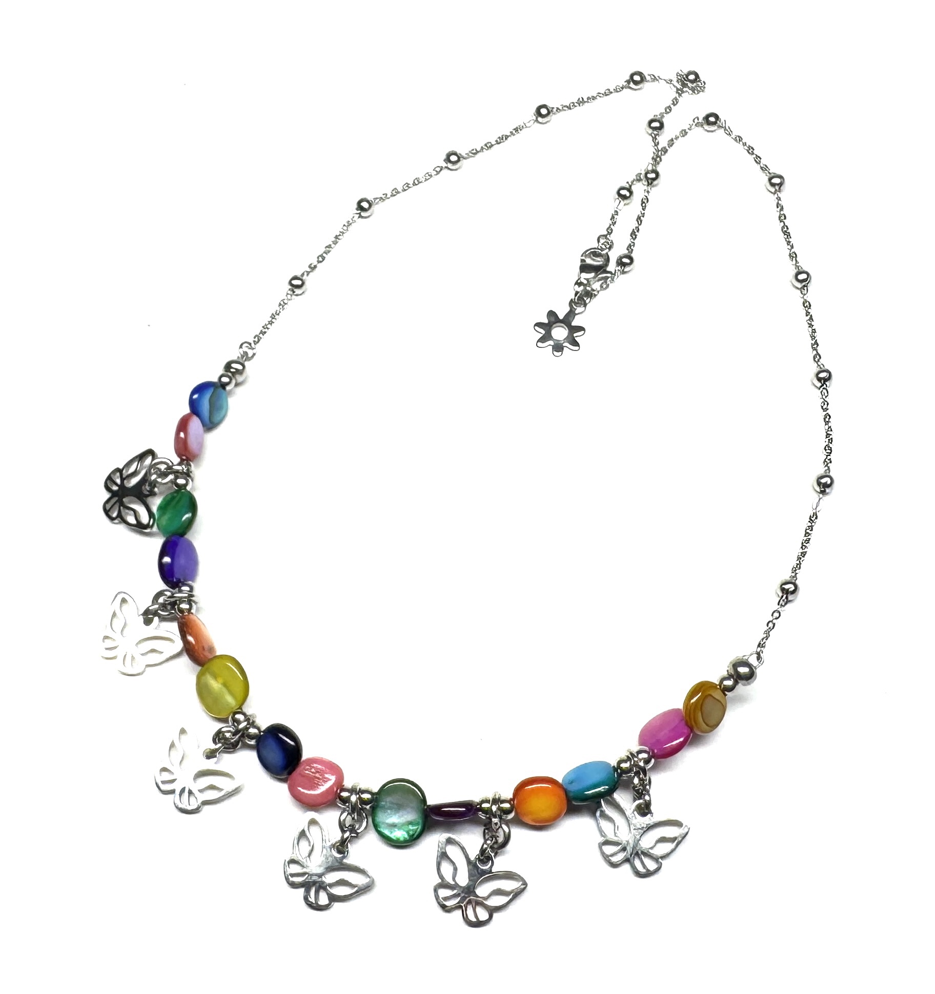 Edelstahlkette aus Muschelperlen, Edelstahlperlen und -schmetterlingen. Gefädelt auf Tiger Tail Draht und filigraner Kette. Karabinerverschluss.