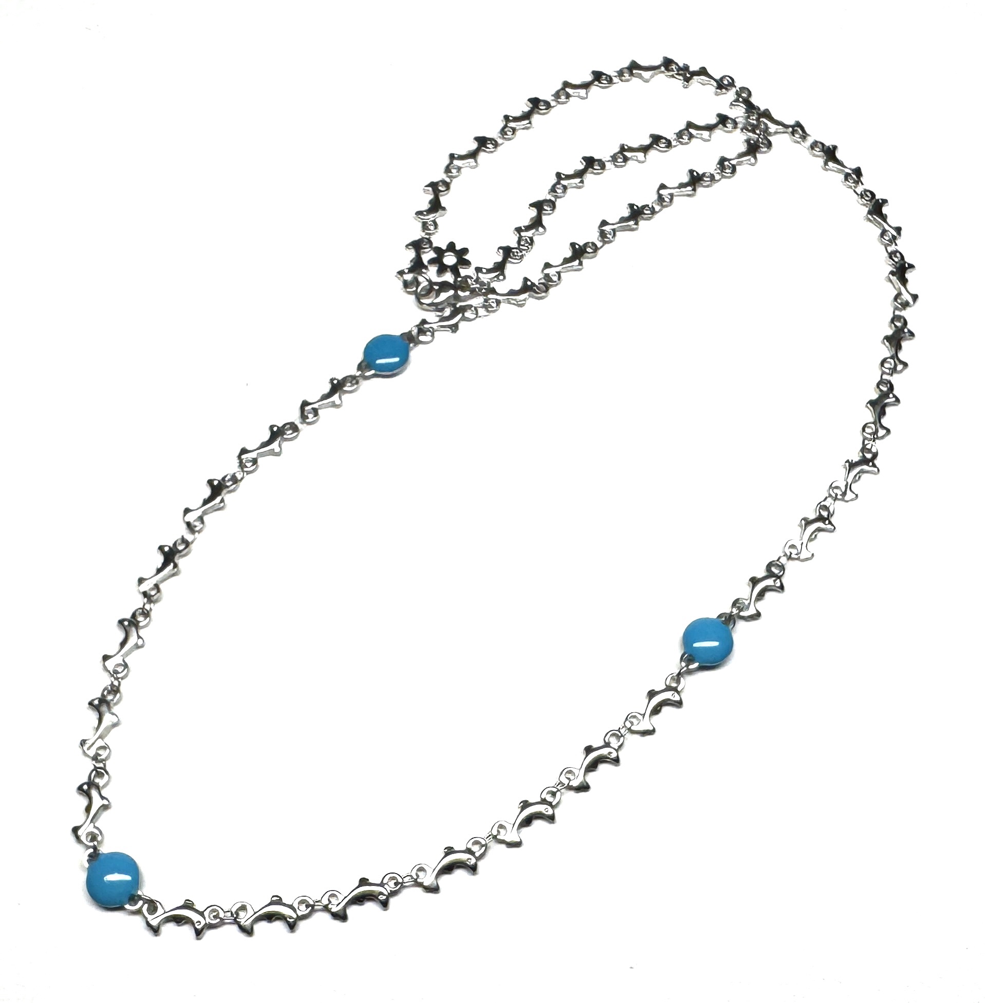 Edelstahlkette aus Delfin- und emaillierten Sequins. Fällt locker den Hals hinunter. Karabinerverschluss.