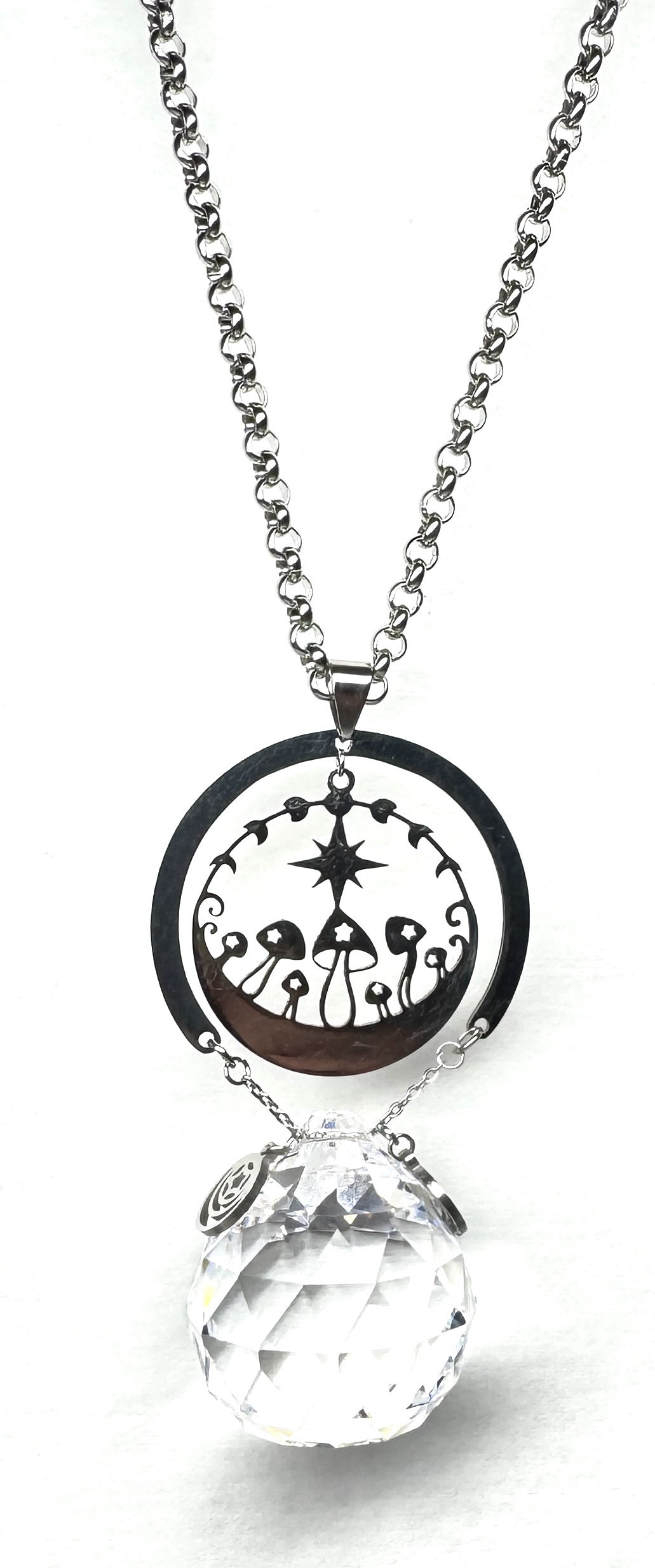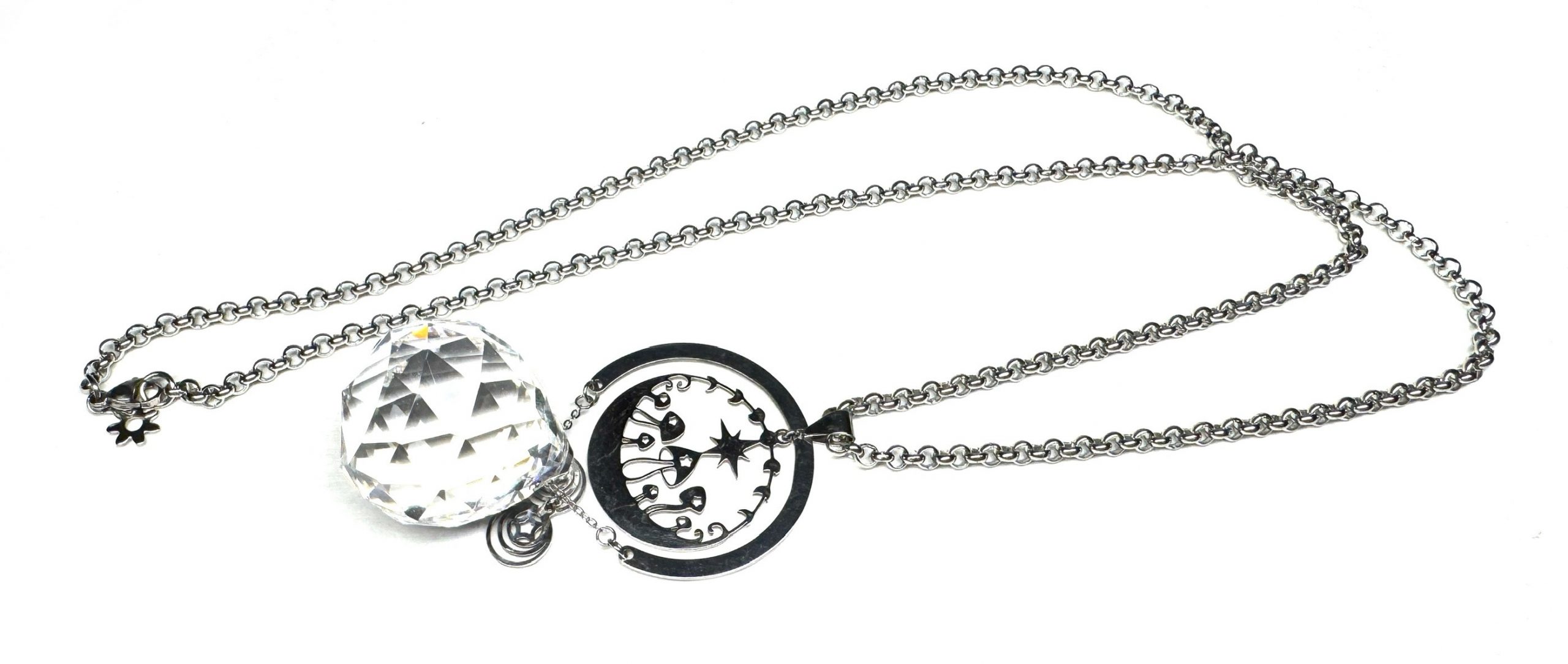 Lange Kette aus Edelstahl mit Edelstahlverbinder, Anhänger aus Edelstahl, großem, facettierten Glastropfen und Edelstahlcharmes. Karabinerverschluss.