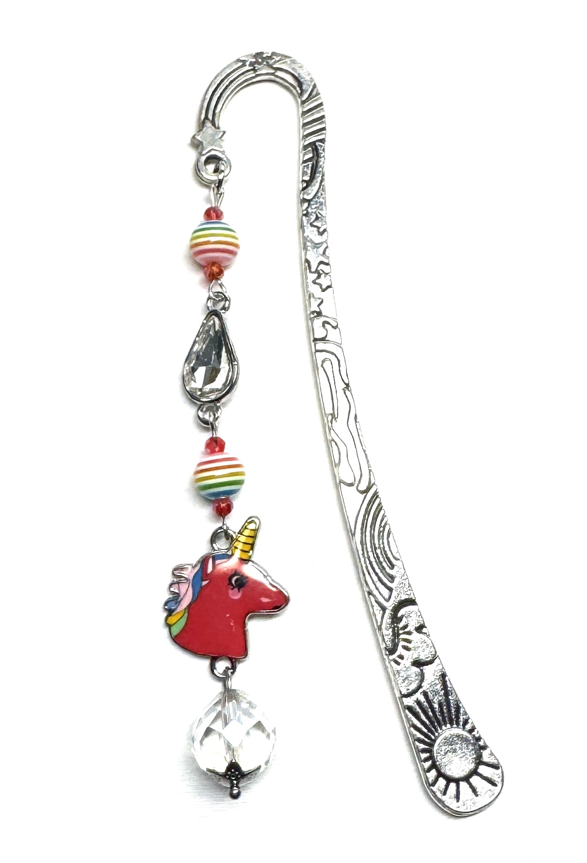 Großes Lesezeichen mit facettierten Glasperlen, glitzerndem Glastropfen, Resinperlen, Perlkappe und emailliertem Einhorn. Die Perlenseite fällt am Buchrücken herunter, man kann das Buch somit auch in ein Bücherregal stellen. 🙂