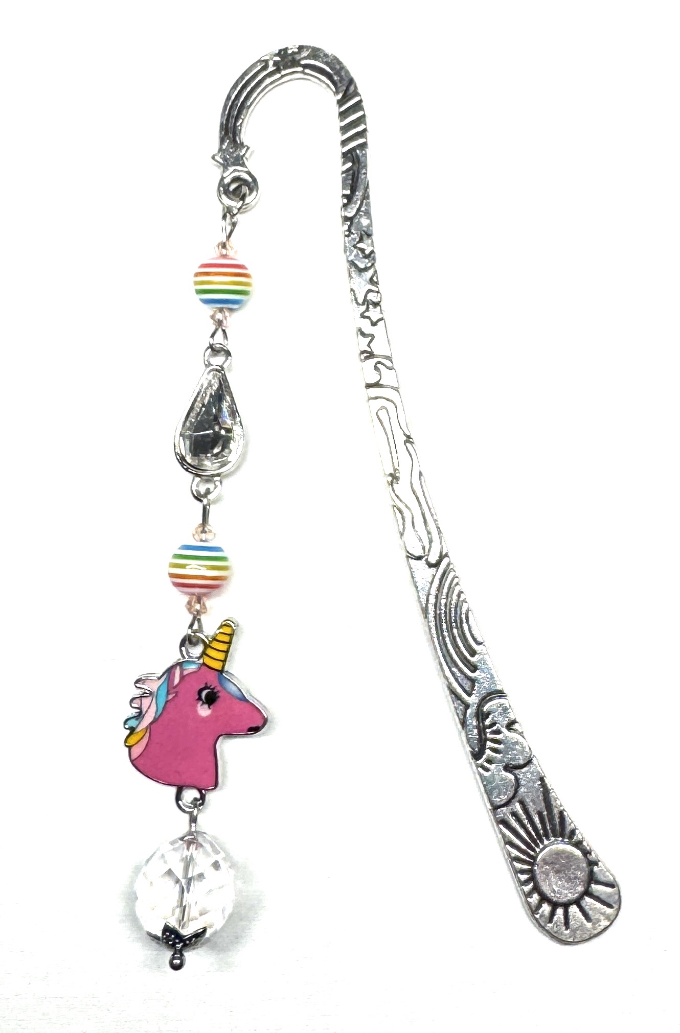 Großes Lesezeichen mit facettierten Glasperlen, glitzerndem Glastropfen, Resinperlen, Perlkappe und emailliertem Einhorn. Die Perlenseite fällt am Buchrücken herunter, man kann das Buch somit auch in ein Bücherregal stellen. 🙂