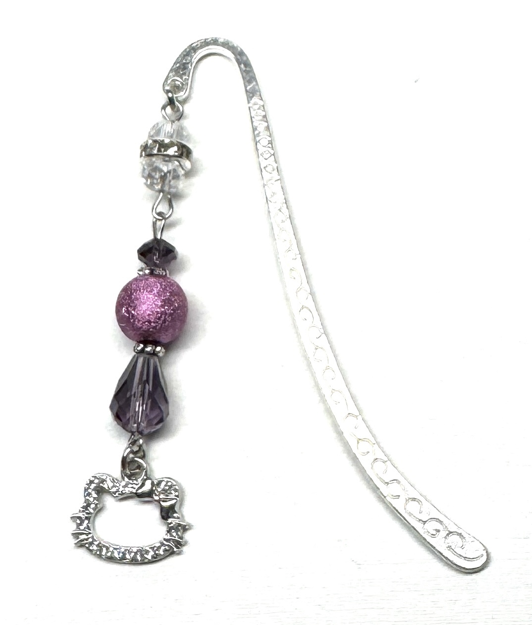 Lesezeichen mit facettierten Glasperlen, strukturierter Kunststoffperle, glitzerndem Perlenring und Kitty-Anhänger. Die Perlenseite fällt am Buchrücken herunter, man kann das Buch somit auch in ein Bücherregal stellen. 🙂