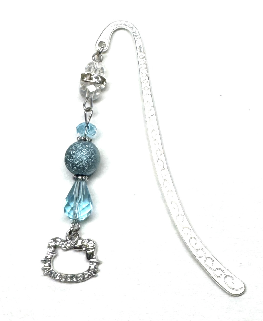 Lesezeichen mit facettierten Glasperlen, strukturierter Kunststoffperle, glitzerndem Perlenring und Kitty-Anhänger. Die Perlenseite fällt am Buchrücken herunter, man kann das Buch somit auch in ein Bücherregal stellen. 🙂