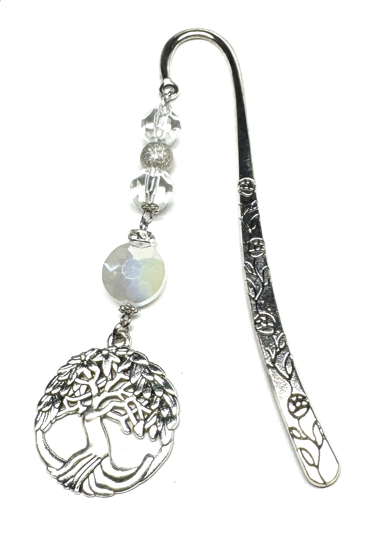 Großes Lesezeichen mit facettierten Glasperlen, glitzernden Metallperlen und großem Lebensbaum. Die Perlenseite fällt am Buchrücken herunter, man kann das Buch somit auch in ein Bücherregal stellen. 🙂