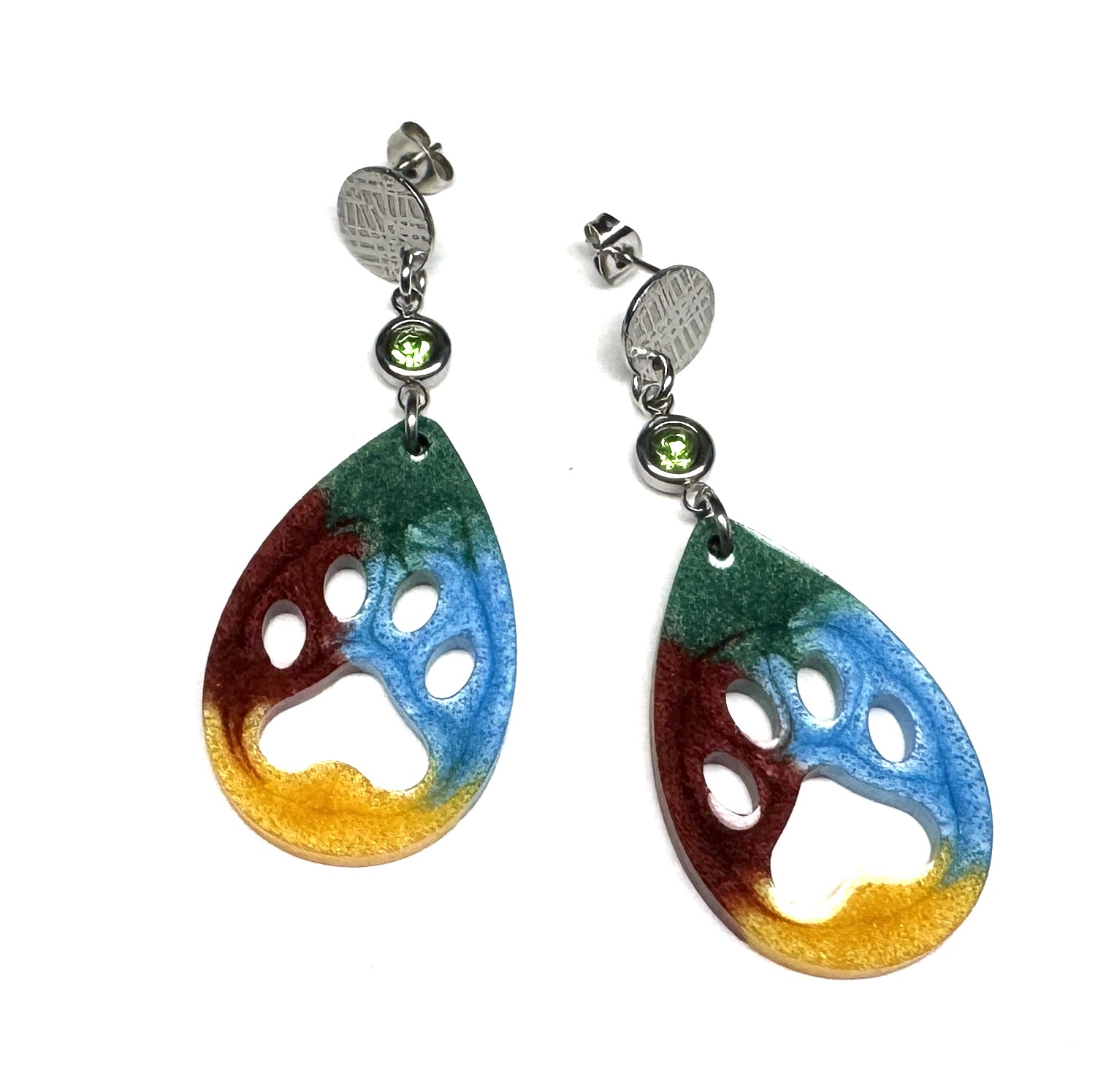Ohrringe aus Edelstahlverbinder mit Strassbesatz und großem, selbstgegossenem Resinanhänger. Ohrmutterverschluss.
