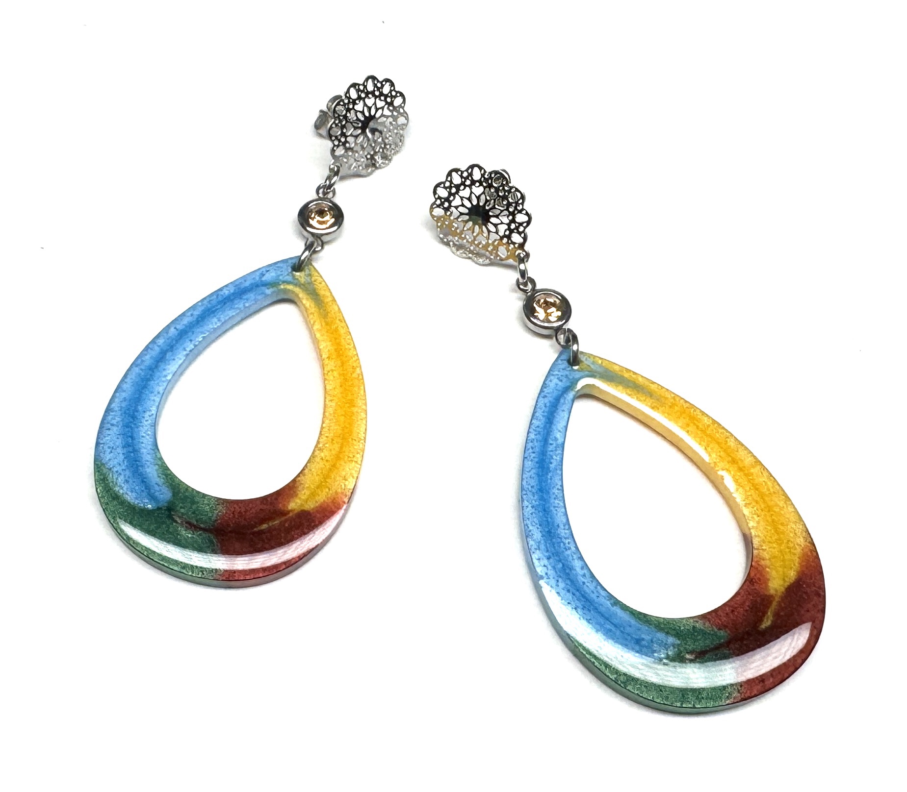 Ohrringe aus Edelstahlverbinder mit Strassbesatz und großem, selbstgegossenem Resinanhänger. Ohrmutterverschluss.