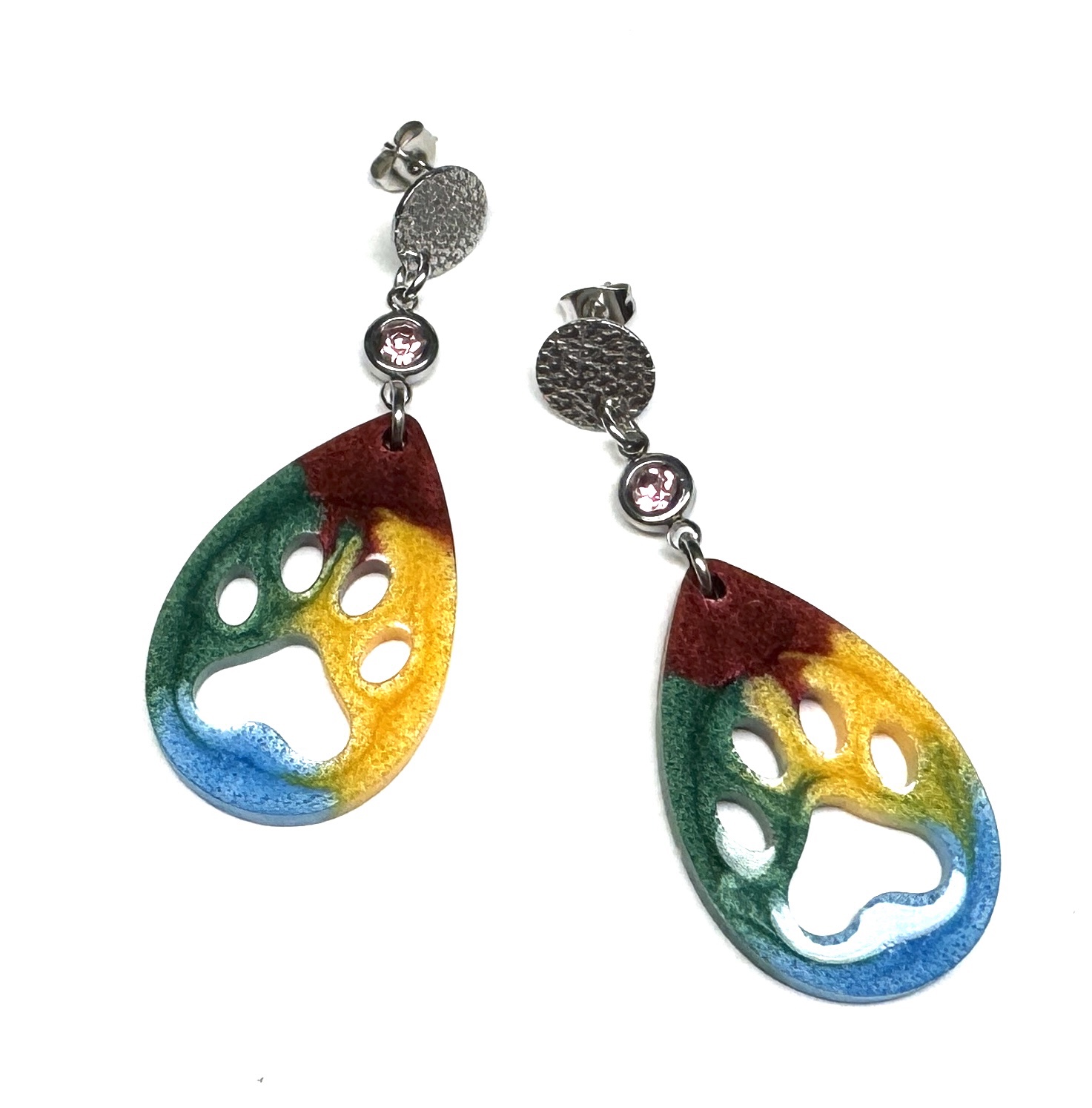 Ohrringe aus Edelstahlverbinder mit Strassbesatz und großem, selbstgegossenem Resinanhänger. Ohrmutterverschluss.