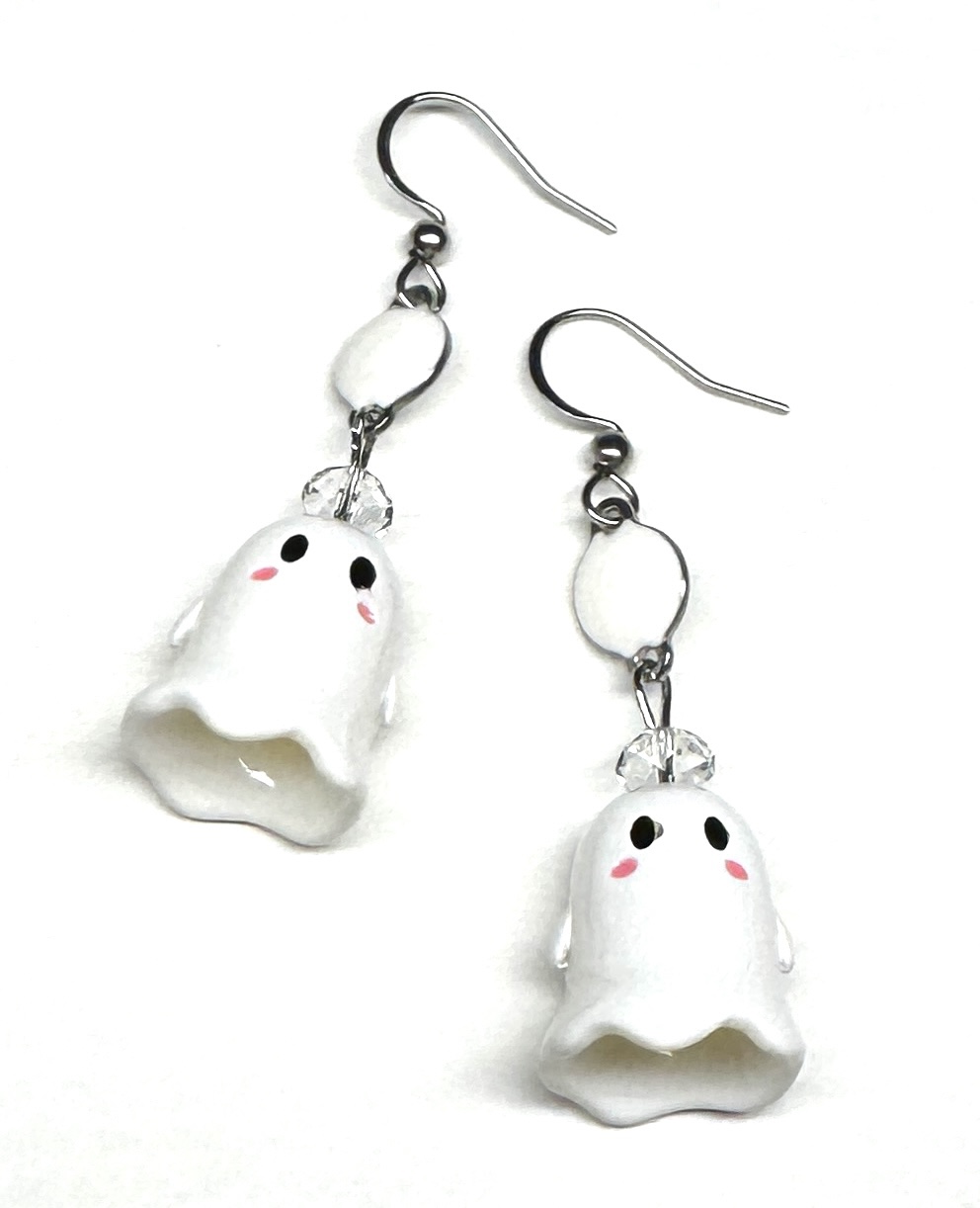 Ohrringe aus 3-D Acrylanhänger, facettierter Glasperle und emailliertem Edelstahlsequin. Französischer Ohrhaken.