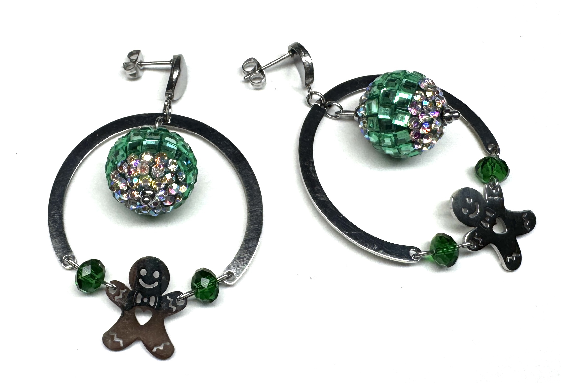 Ohrringe mit großer Discoperle aus Polymerton und Strass-Steinchen, Edelstahl-Ring, facettierten Glasperlen und Lebkuchenmännchen aus Edelstahl. Ohrmutterverschluss.