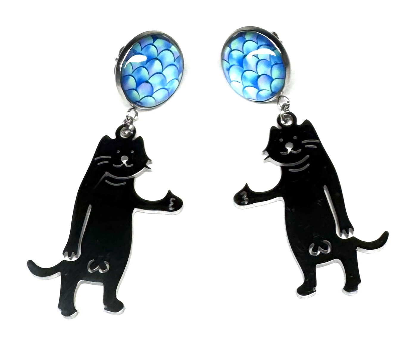 Große Ohrstecker aus Edelstahl mit Glas-Cabochon und Edelstahlanhänger. Ohrmutterverschluss.