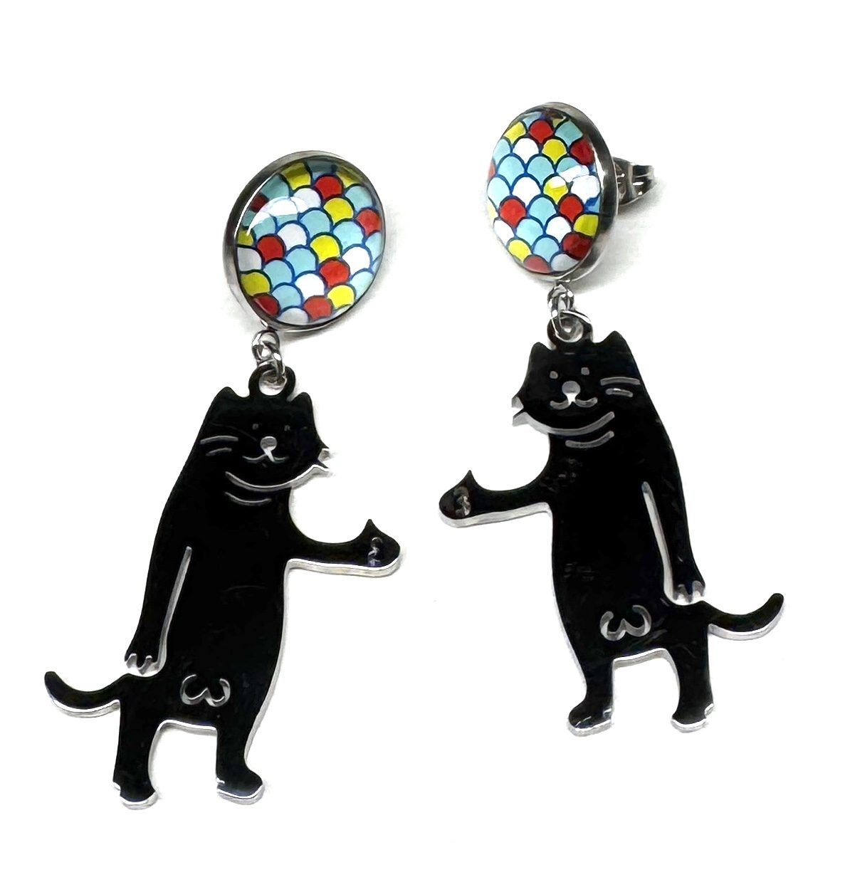 Große Ohrstecker aus Edelstahl mit Glas-Cabochon und Edelstahlanhänger. Ohrmutterverschluss.