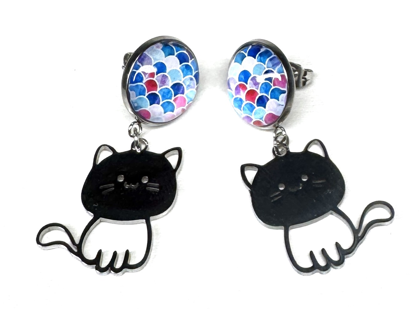 Große Ohrstecker aus Edelstahl mit Glas-Cabochon und Edelstahlanhänger. Ohrmutterverschluss.